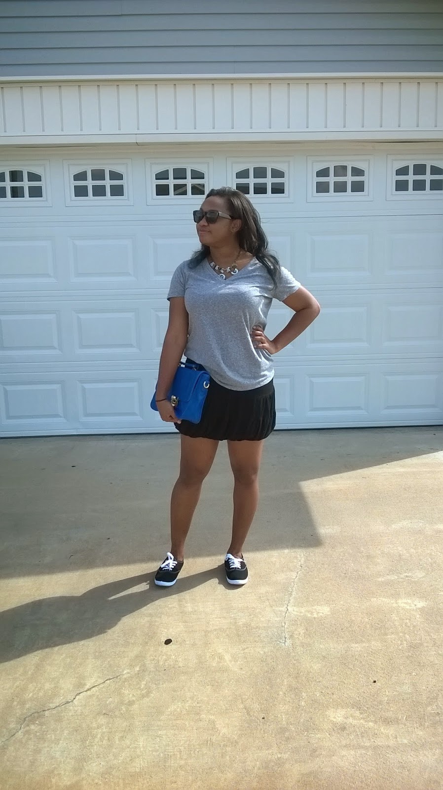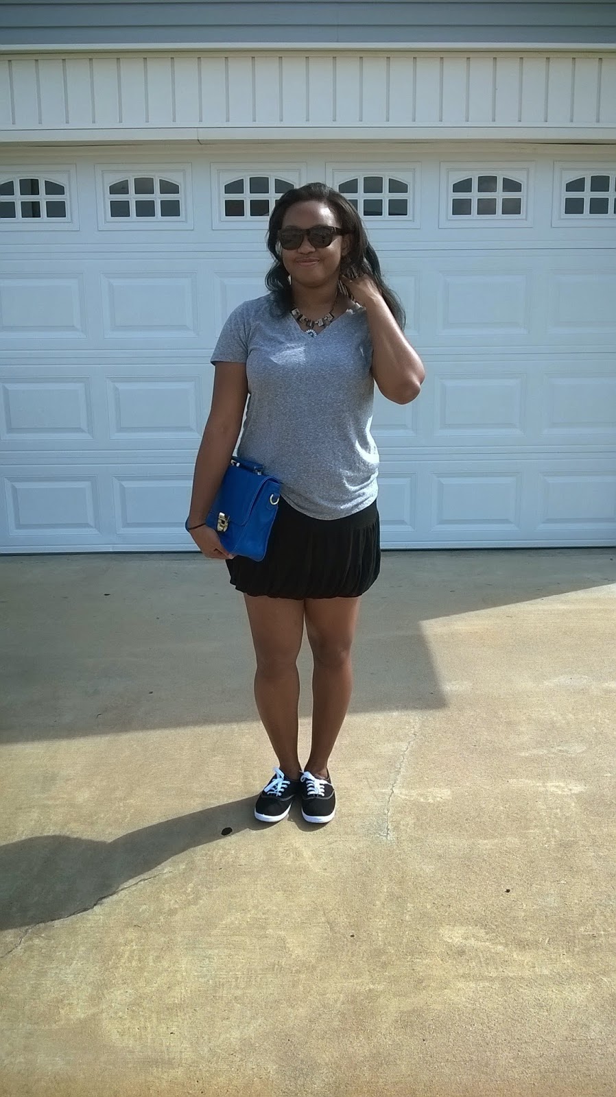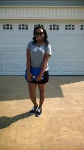 Hey Loves! So here’s the second edition to “Dressing up a Basic Tee” but I opted to go with a feminine sporty look. This comfy gray tee I scored at Target for $5 a couple of weeks ago. The black skirt is so old I honestly can’t remember where I got it from. (Don’t judge you guys!) My comfy sneakers I got from Rue 21. I decided to add a little something flashy to an otherwise simple outfit by adding this statement necklace from Charlotte Russe. My sunglasses are also courtesy of Charlotte Russe. This outfit is perfect for a full day of running errands or riding bikes through the park. It is easy for a day when maybe you’re running late and need to throw on something casual and comfortable. What’s your lazy yet fabulous getup? Sweatpants and tank? Cardigan and shorts? Let me know below!!! XO and Stay FAB! – Stormie