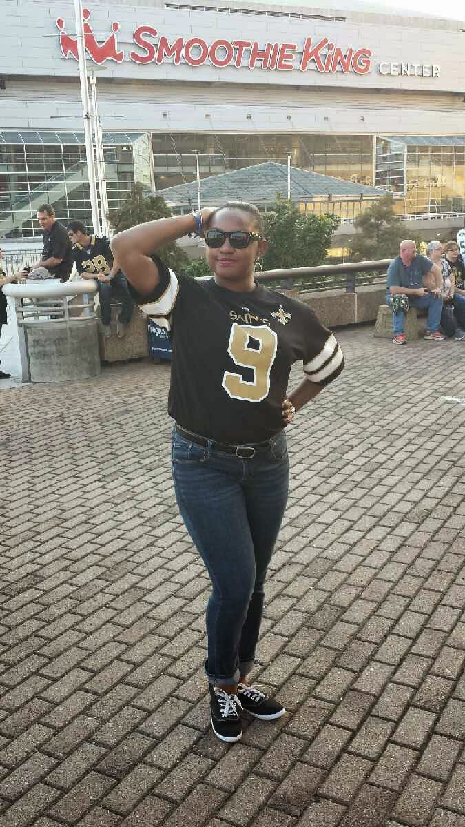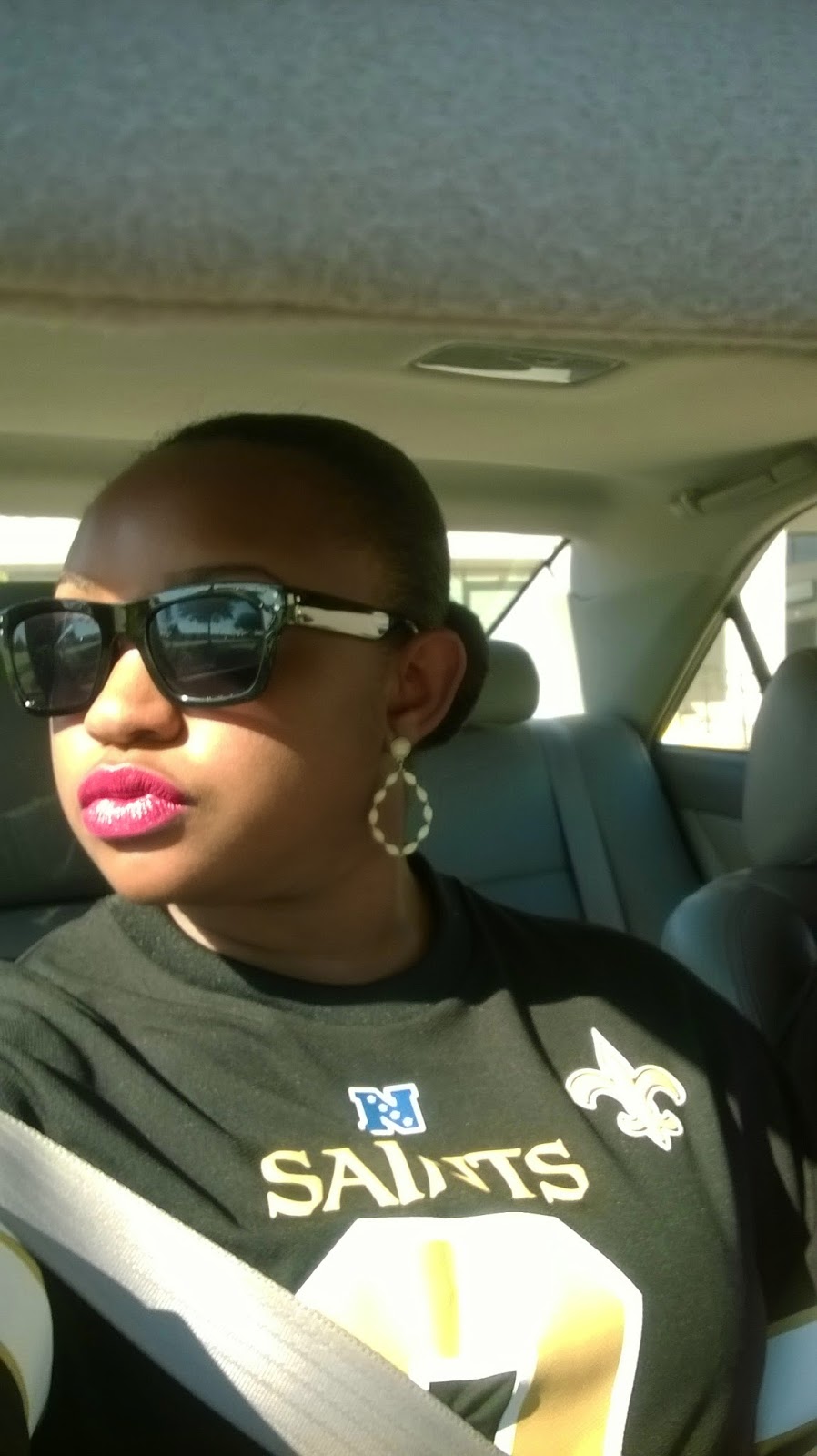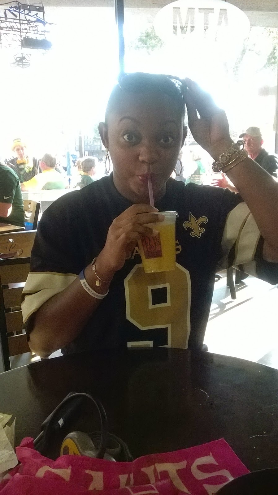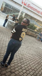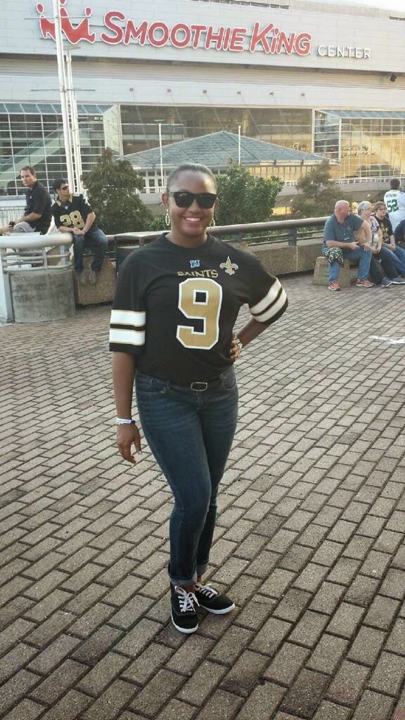 As I prepared for the day’s festivities I of course had to rock some Saints paraphernalia. I am rocking this jersey courtesy of my aunt Erika. Considering all the moving around that I was going to do, I figured I need to be as comfortable as possible. I opted for some simple jeans with sneakers. The humidity has been extremely ridiculous lately so I decided to keep my hair in a bun and go for a bold lip. So I felt that I was able to represent my fave team while being comfortable and fabulous. (Triple win huh) lolz