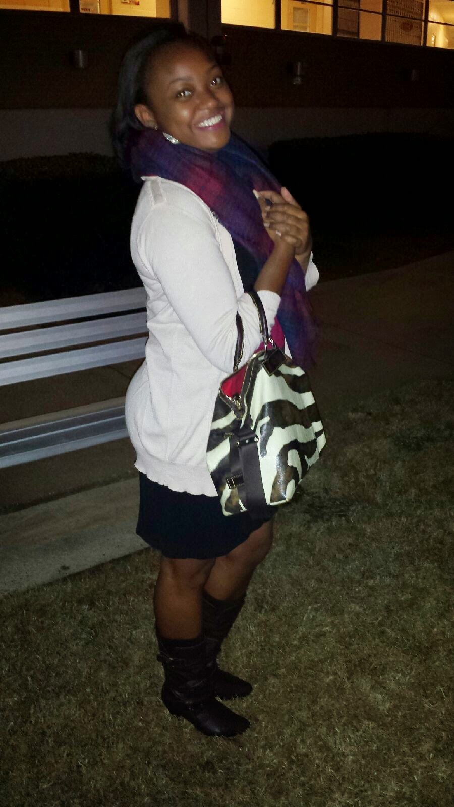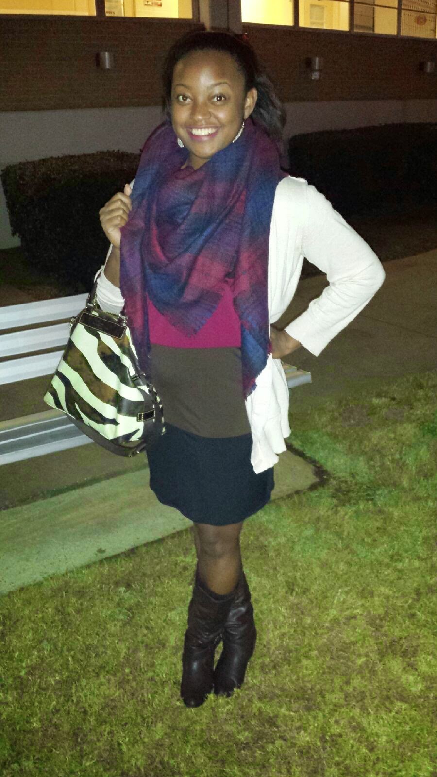 This particular scarf came from Forever 21. I opted to pair it with this dress and long oversized cardigan. I really wanted the scarf to be the focal point of this outfit. I decided to go with these old brown boots to complete the look.