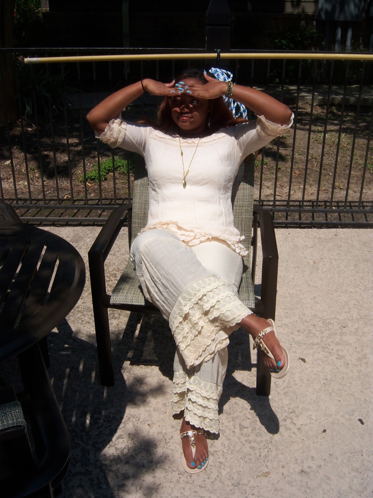 In today’s post, I am in chilled light layers for a relaxing (yet hot) day at the pool. I actually really like this two piece set because there isn’t a lot of fuss. You simply throw this on with some accessories and you’re out the door. Major s/o to my Nana for getting me this outfit. It is super comfy! I opted for nude and gold accessories. I have really been digging nude and gold lately. I love those two colors together. I feel like they go well together no matter the outfit or occasion.