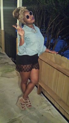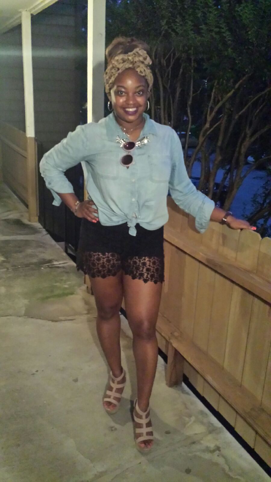 I absolutely loved this outfit. (I know it is dark out, but I just like these sunglasses alot lolz don’t judge) You guys know I love me some denim especially chambray shirts. I paired it with these crochet shorts that I think are so sexy. I threw my hair up in a messy bun because it was too hot to be all on my neck. (Anyone else familiar with that struggle?) I took this scarf and wore it like a headband with these wedge heels and some sparkly jewelry.