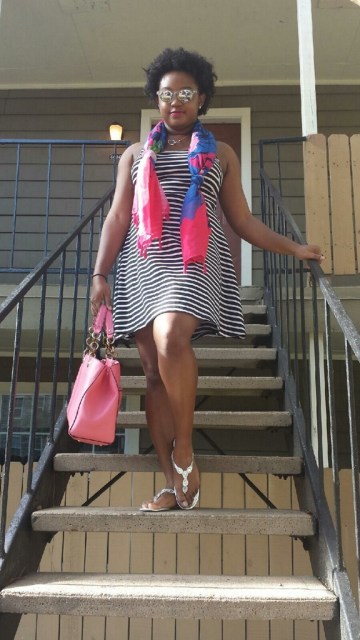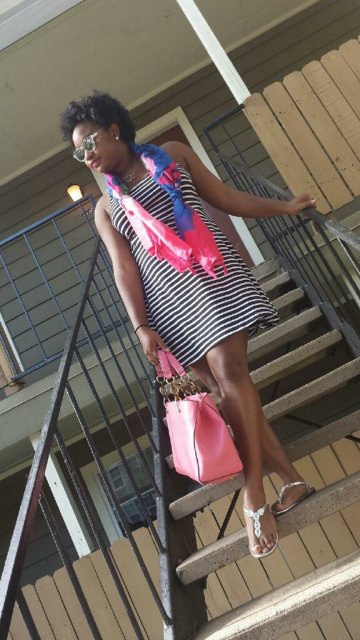 Hey Sweetie Pies! In today’s post I want to share an #OOTD for you all. Now as many as of you may already know, I am in love with stripes and florals alike! I love how feminine and fun this outfit is! Since my dress is black and white stripes, I opted for a burst of bright color with this watercolor floral scarf! What do you sweetie pies think?