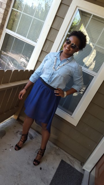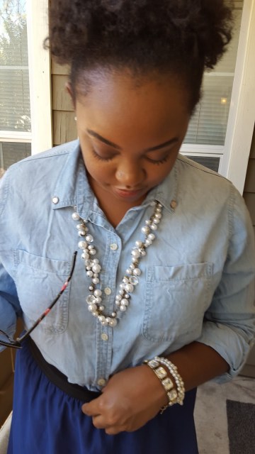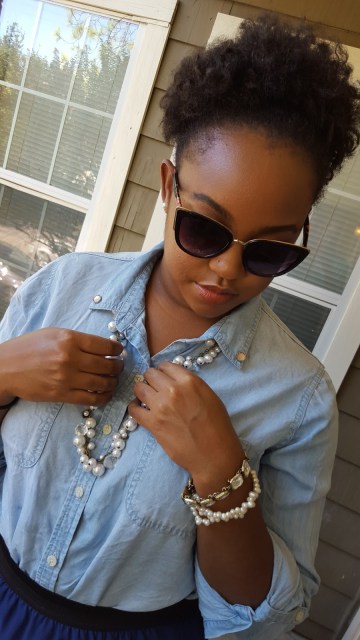 What do you guys think of this look? I wore this look the other week for work. I loved it! You guys know I love me a denim shirt! I loved the pearls and the crystals together. My pearl necklace and crystal bracelet are both from Chloe+Isabel. I wanted to add a little more flair to my shirt so I added these stud earrings from +CharmingCharleHQ to my collar. I really liked the outcome! I will definitely be trying this other blouses, ones that have collars in particular. I opted for these new strappy heels from A’Gaci to add a hint of sexy. (I probably still look like a 7th grader with my little fro though, HAHA!)