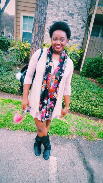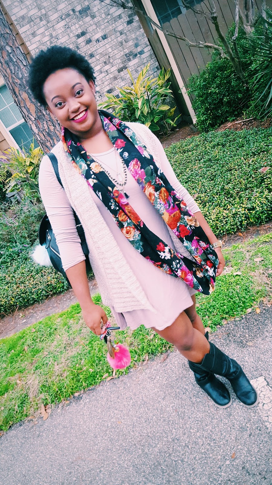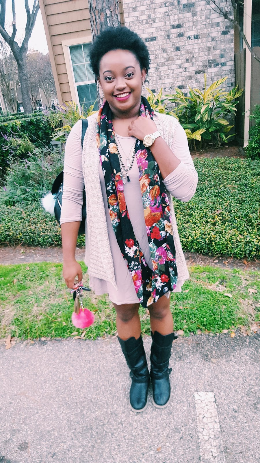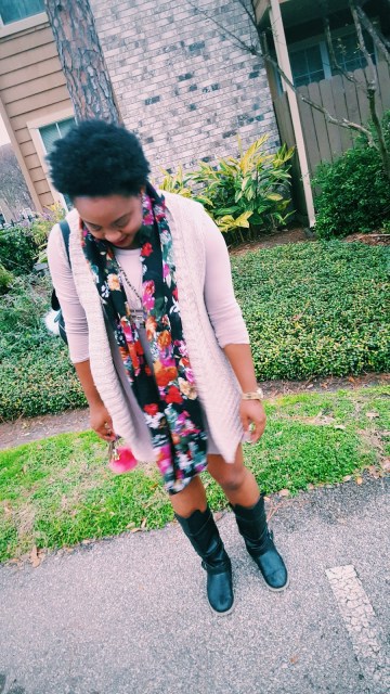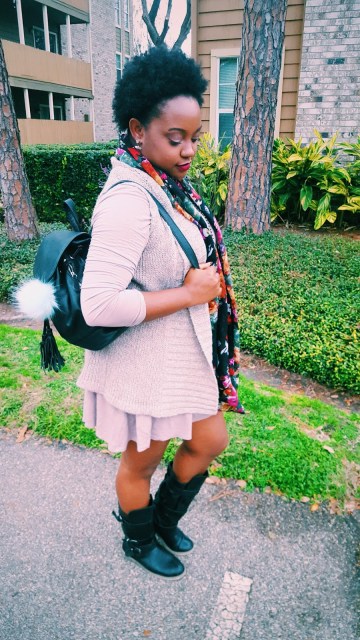 I think the reason why this worked was because not only the use of different textures, but also proportions. I started with this basic soft t-shirt dress and then added this chunky knit sweater vest. I then opt for this floral scarf. I bet you’re probably wondering why did I go for this scarf in the middle of winter and my answer is simple, because it is black! Yes it does have multicolored flowers on it but it works since most of my look consists of basic nudes. I threw on these tall chunky boots and opted for my backpack purse in a matching color. Not only are these boots comfortable, but were ideal since it rained the day I wore these. #Functional
