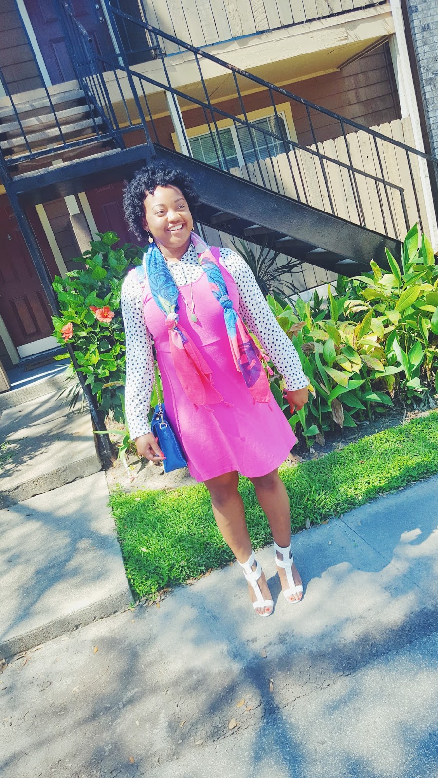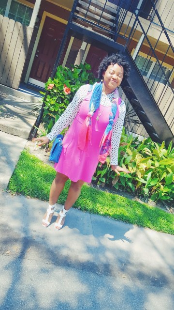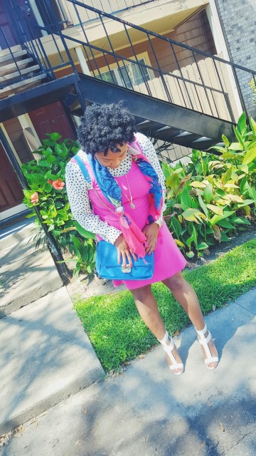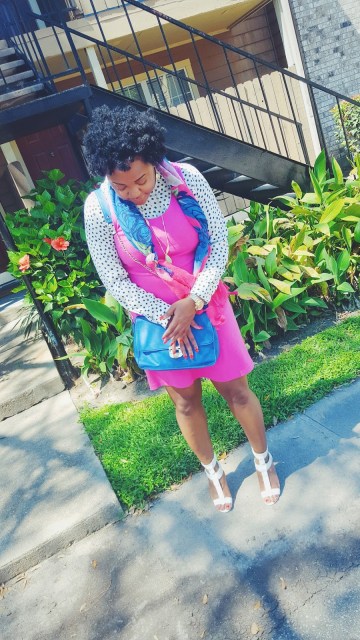 Hey Sweetie pies, TGIF! I created this look which is totally reminiscent of the 70’s with a colorful twist. I started off with this polka dot print blouse from the WhoWhatWear collection at Target and then I layered this pink fit and flare dress over it. Lastly I threw on this vibrant floral scarf that is thin enough to not overwhelm the look. I was totally digging Spring vibes for this look hence the white caged heels and blue handbag. And of course, I am rocking the au naturale cuorlzzzz, lolz.