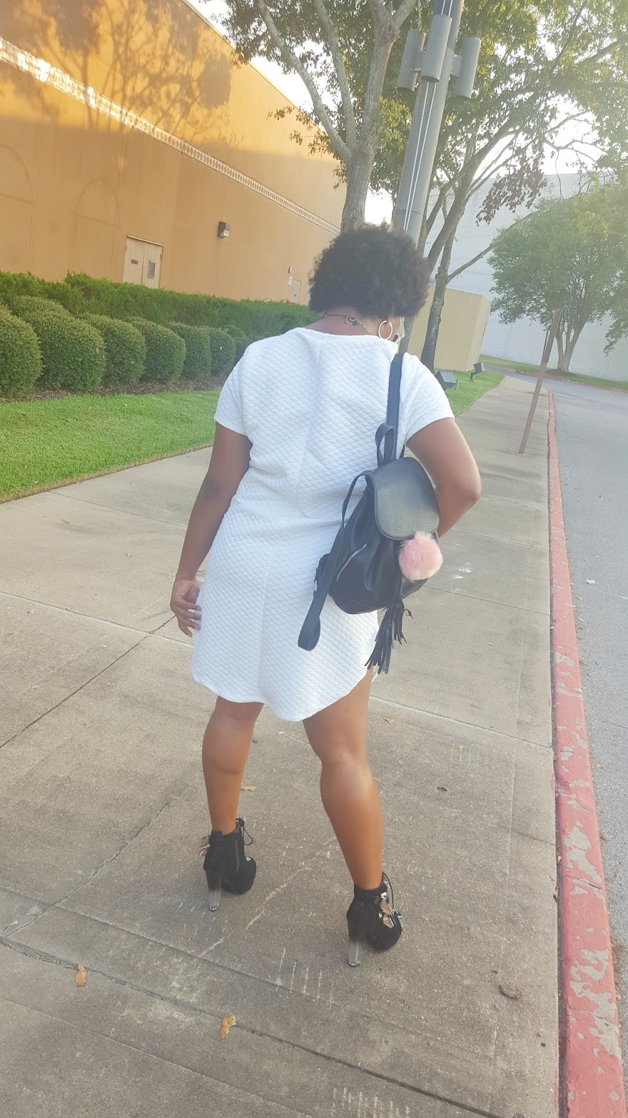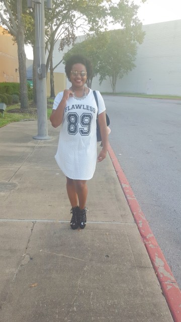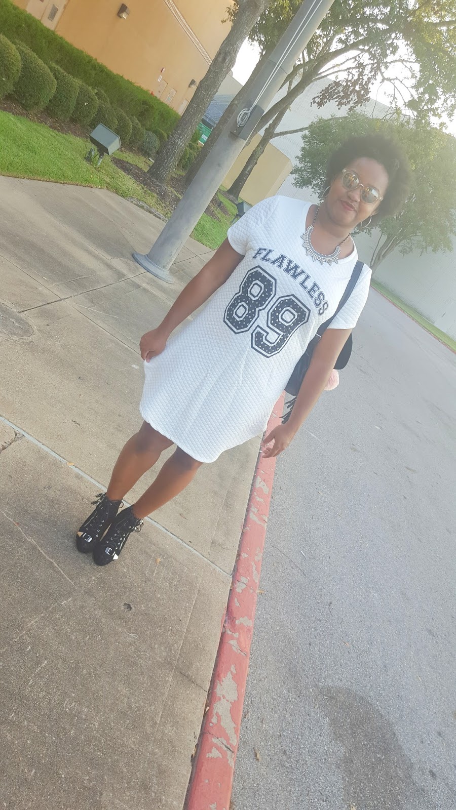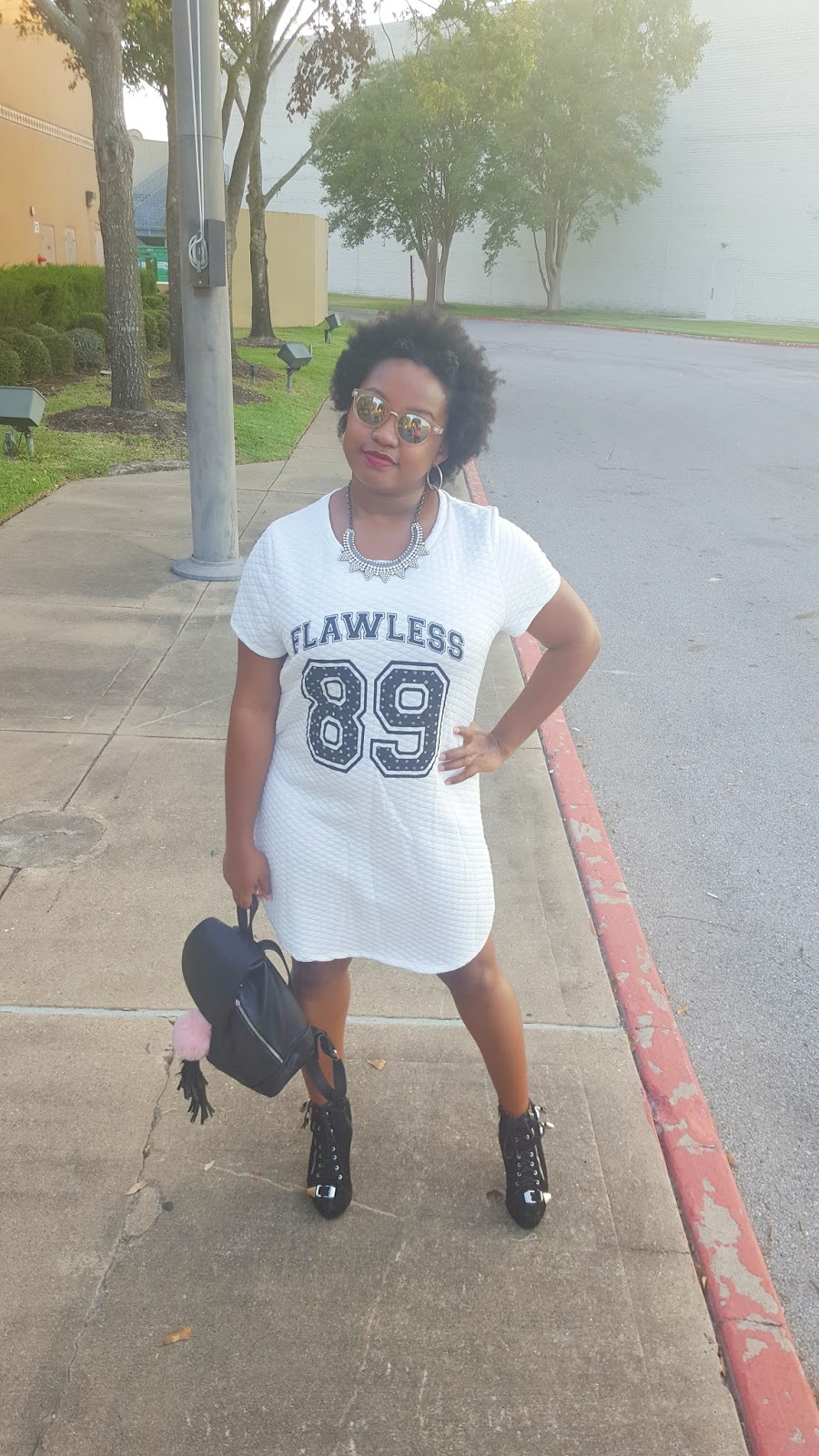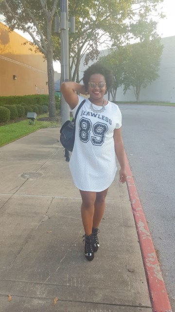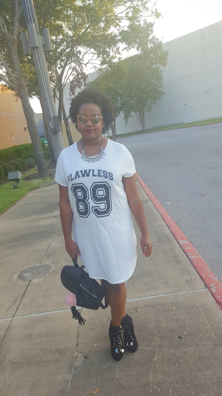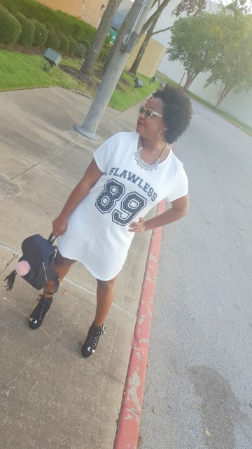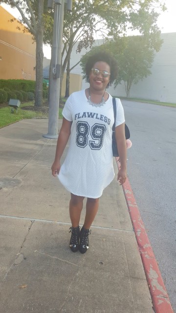 So I am back with my Fall Go-to look, t-shirt dress and booties! I think that this is the #BloggerApproved look for Fall! It is so easy to accessorize and layer. For cooler temps, I will opt for a leather jacket or a bomber jacket. What you think?