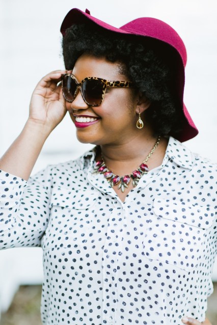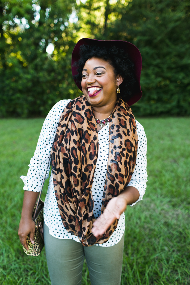 In traditional ‘So Fabulously Sweet’ fashion, I had to take this look up another notch. I am sucker for mixing prints but I had to make sure that whatever print I use contain only neutral colors. This way it wouldn’t overwhelm my entire look. You know your girl loves some leopard so I grabbed this scarf and mini purse from +Charming Charlie and paired it with these minaret tiger eye petite drop earrings from my boutique. The mixing of the polka dots and the leopard print worked here because of the contrast created by the bold leopard and the minimal polka dot.