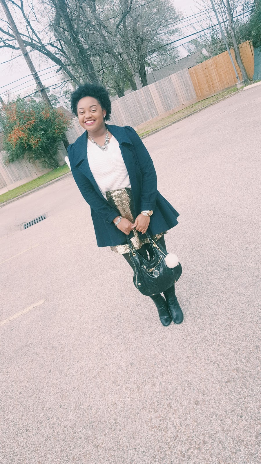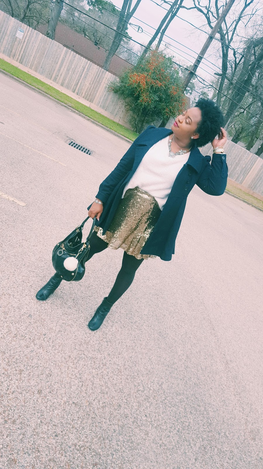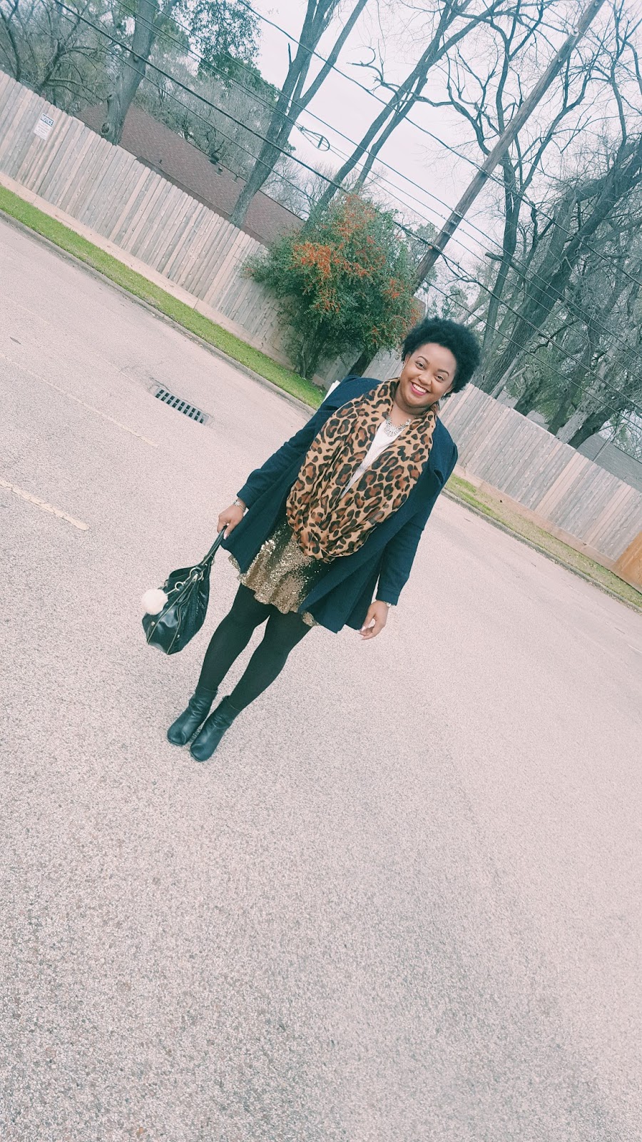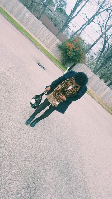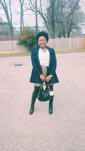 So you all know that I have been digging anything sparkly such as sequins. Contrary to popular belief, sequins can worn during the day. My biggest tip? Pair your sequin number with something casual in a different texture. I loved pairing my skirt with this chunky sweater tights and booties! It was really cold the day I wore this so I added this scarf for a nice print. (A nice print brings dimension to your outfit.)