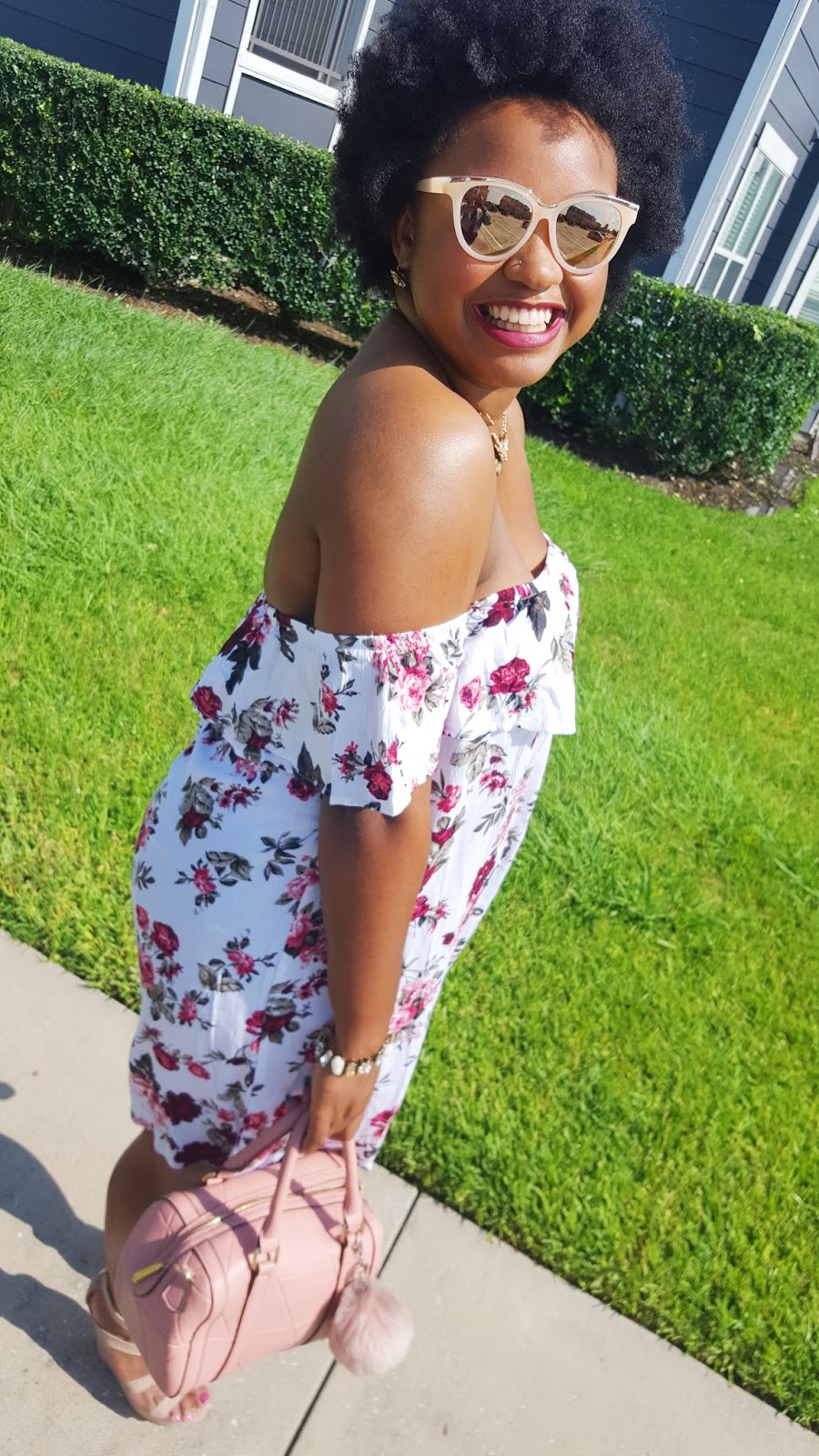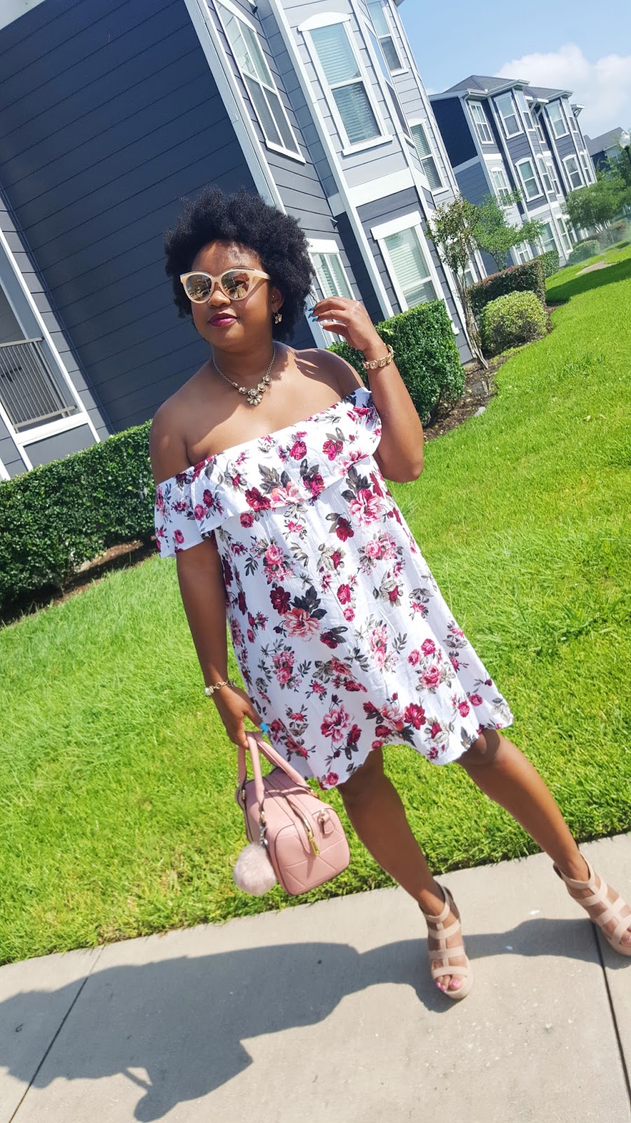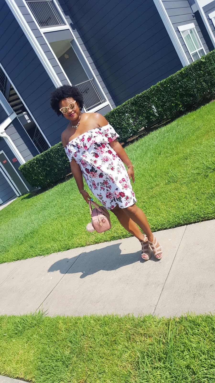 Hey hey sweetie pies! Happy Tuesday! I am so excited to share this beautiful off the shoulder dress with you all! I saw this dress in a local store and I fell in love! I am a sucker for anything floral (what else is new?) as well as soft feminine colors such as pink and red. Pink and red is such a great color combo for spring and summer. I want to wear it as much as possible! I also opted to accessorize with tan and gold metallic as a neutral. It was a surprising refreshing twist to this outfit. Plus metallic anything is GREAT for summer! Swap out the wedges for a pair of gold gladiator sandals for a vacay look!