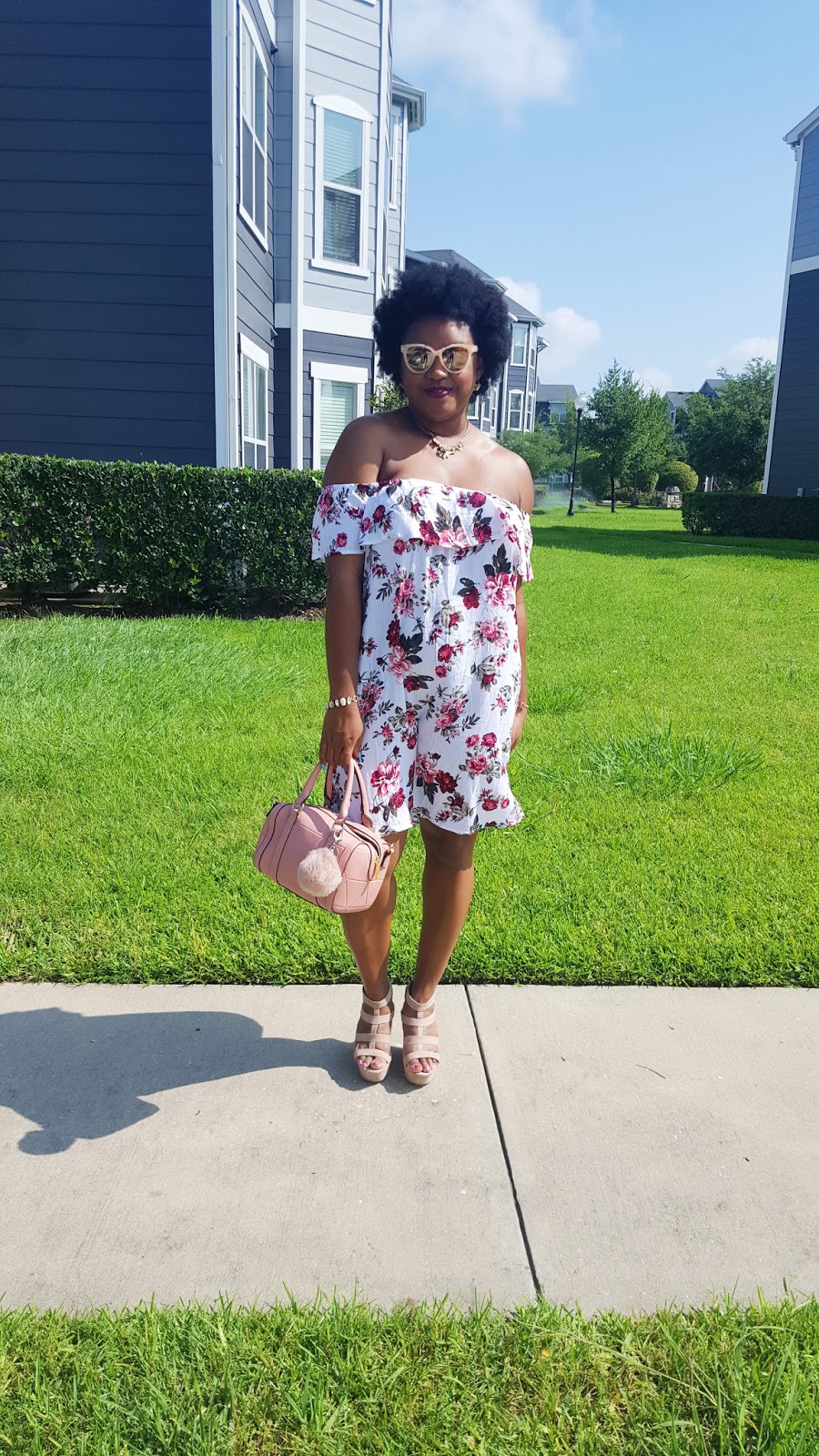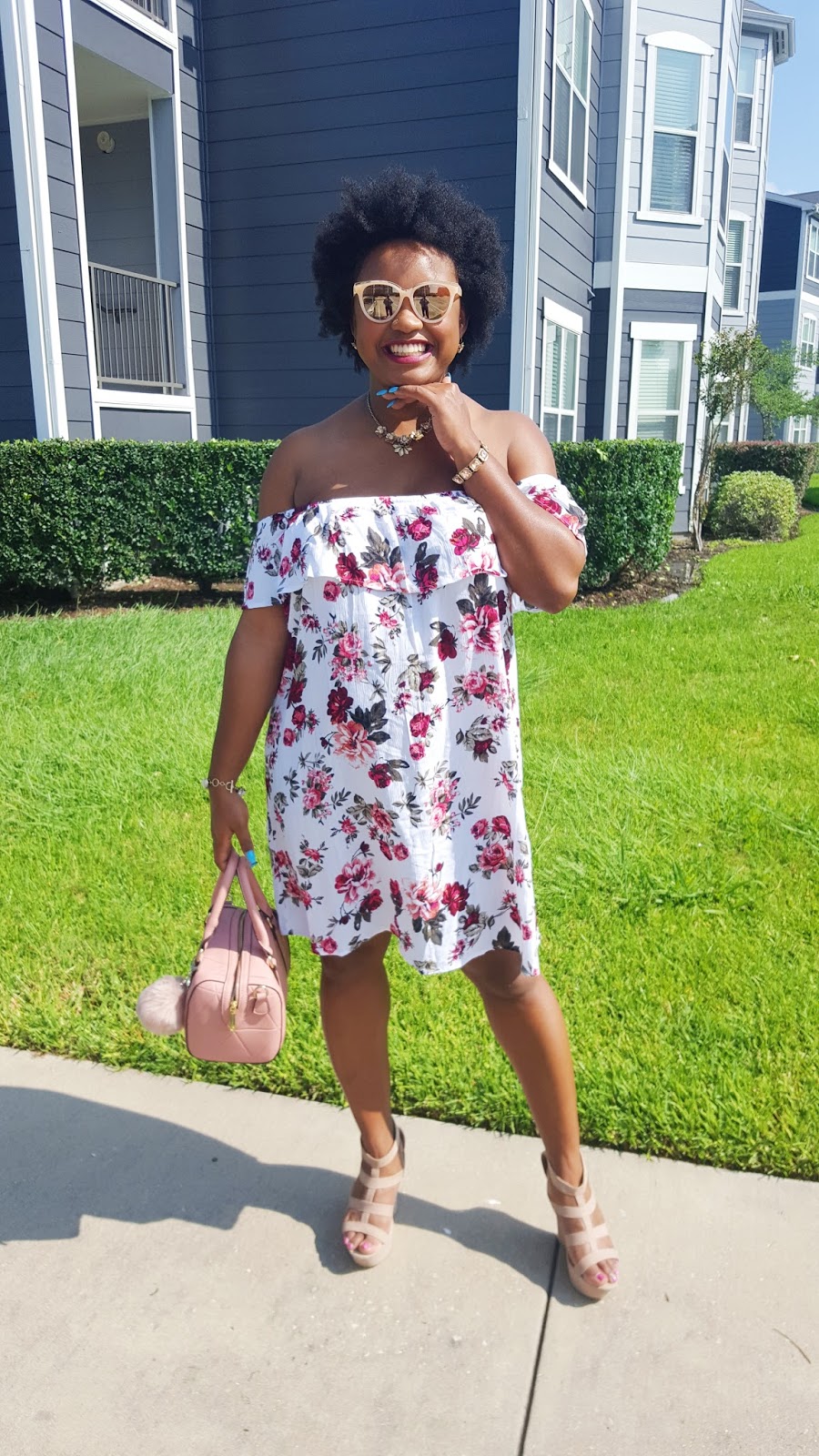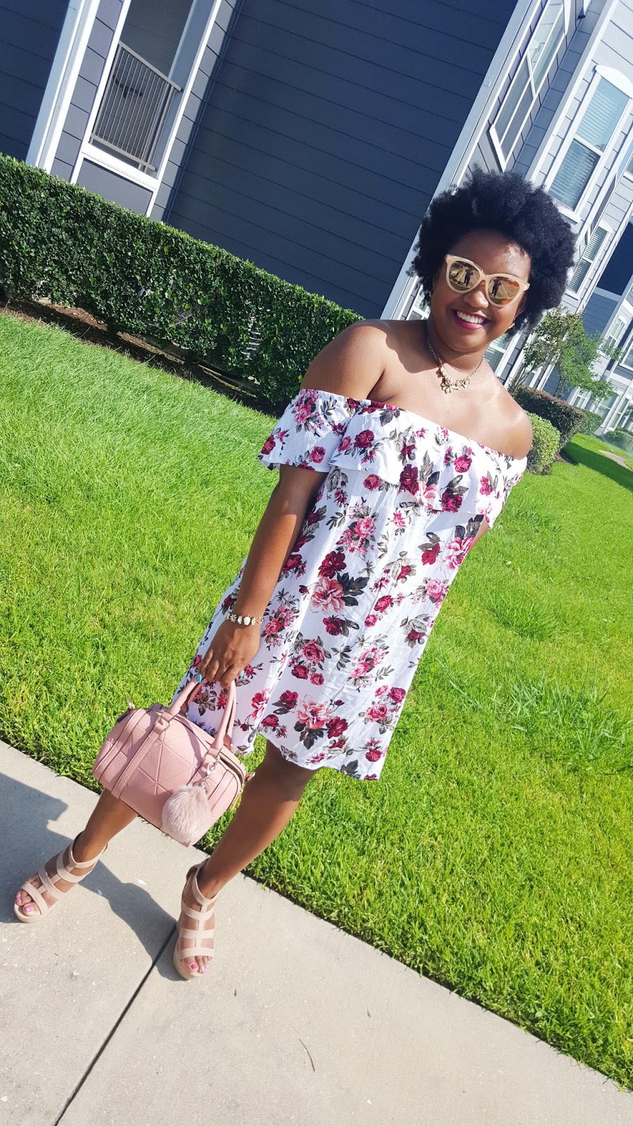 Hey hey sweetie pies! Happy Tuesday! I am so excited to share this beautiful off the shoulder dress with you all! I saw this dress in a local store and I fell in love! I am a sucker for anything floral (what else is new?) as well as soft feminine colors such as pink and red. Pink and red is such a great color combo for spring and summer. I want to wear it as much as possible! I also opted to accessorize with tan and gold metallic as a neutral. It was a surprising refreshing twist to this outfit. Plus metallic anything is GREAT for summer! Swap out the wedges for a pair of gold gladiator sandals for a vacay look!
