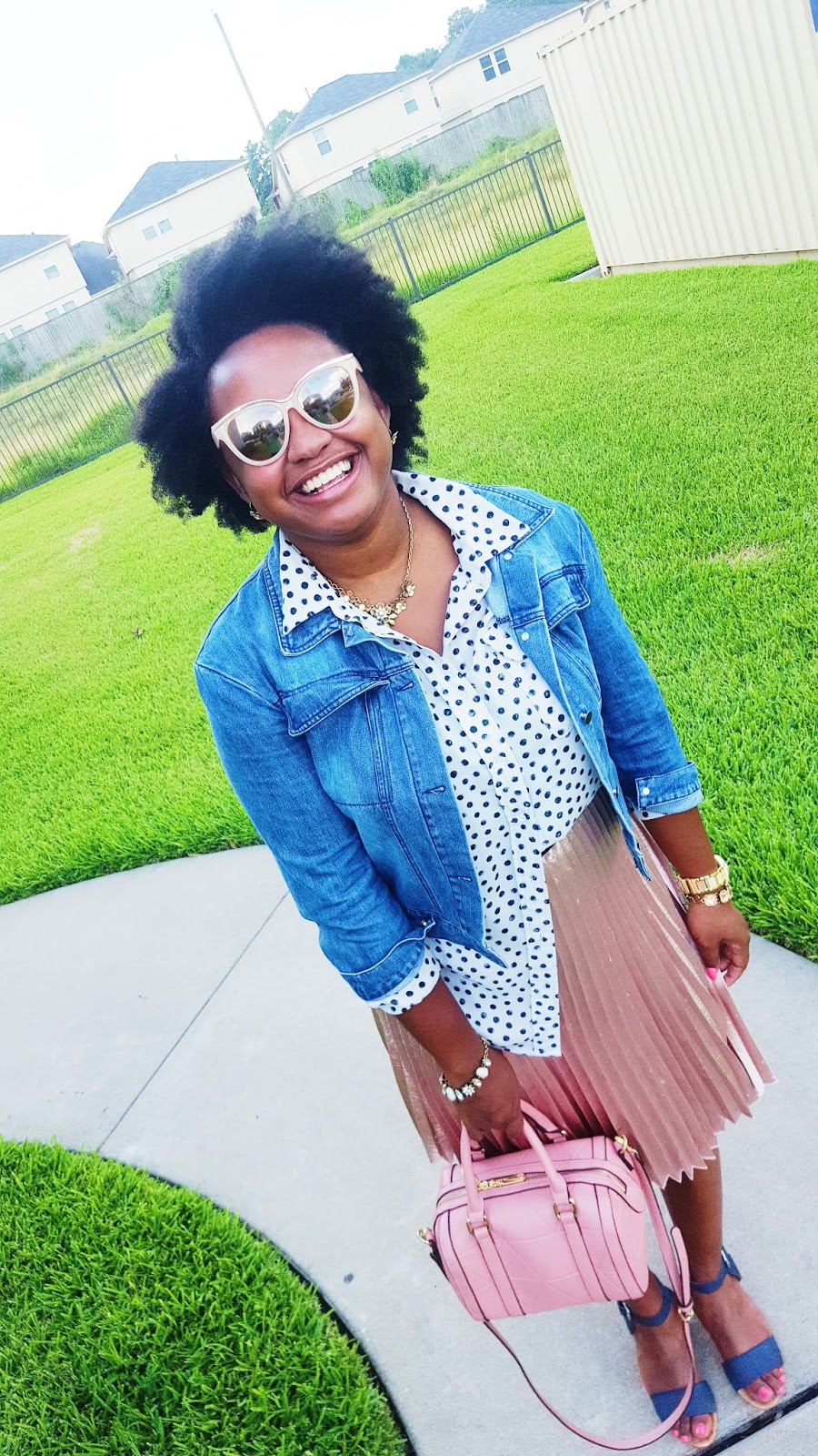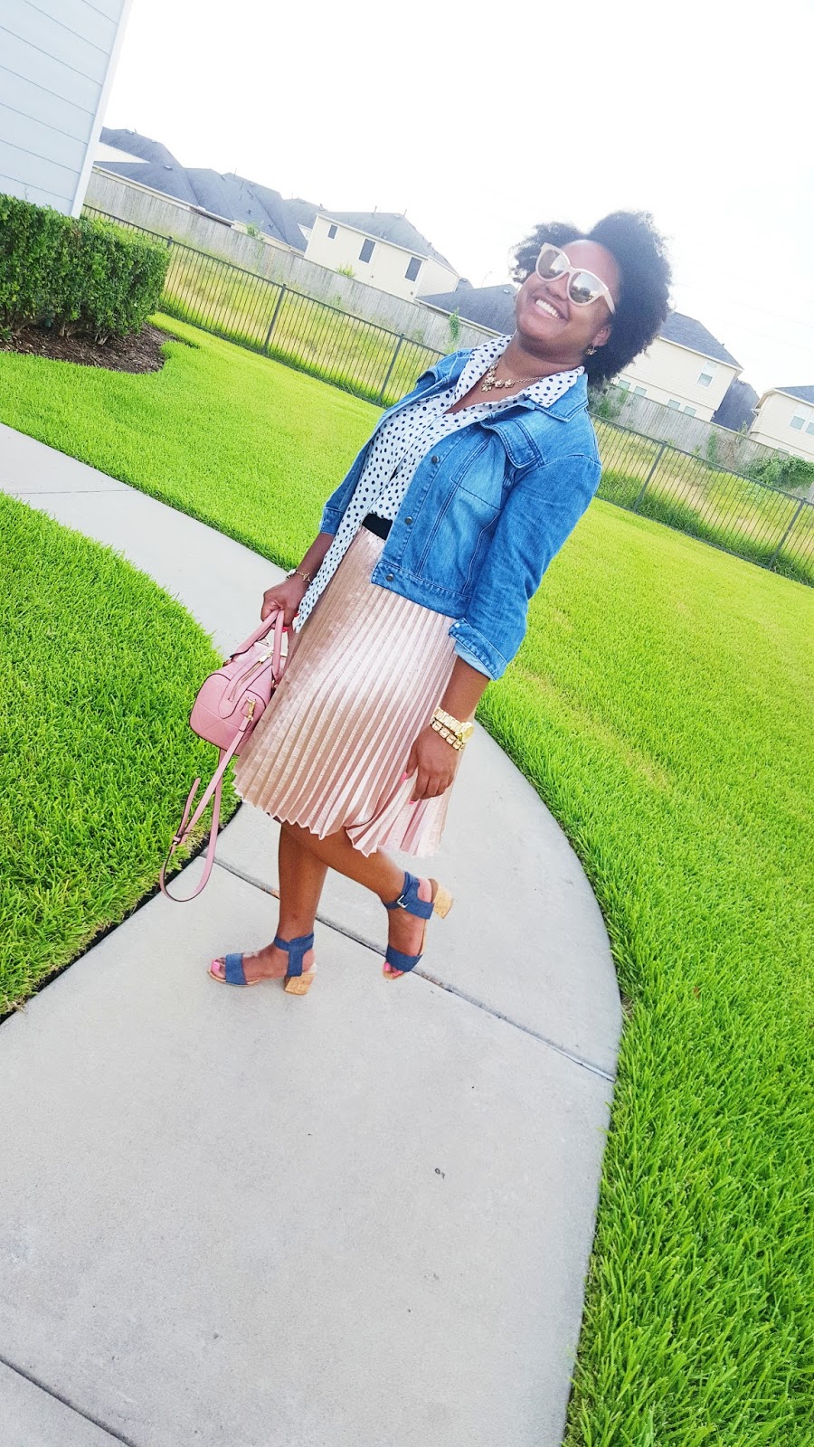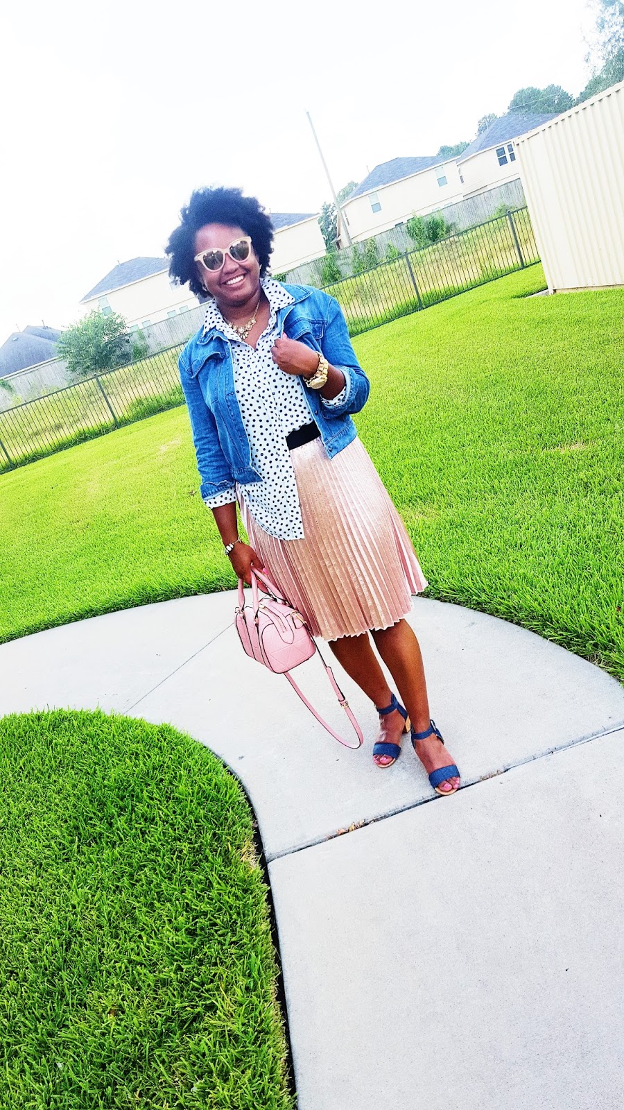 Hey sweetie pies! Happy Tuesday! I hope you all had a great day! Check out this look that I created for work. I started with my rose gold pleated skirt and added some dimension with the polka dot blouse. To keep it fun and light, I opted for my denim jacket and denim sandals. I decided to do a half tuck with my blouse to make it more interesting and dimensional.