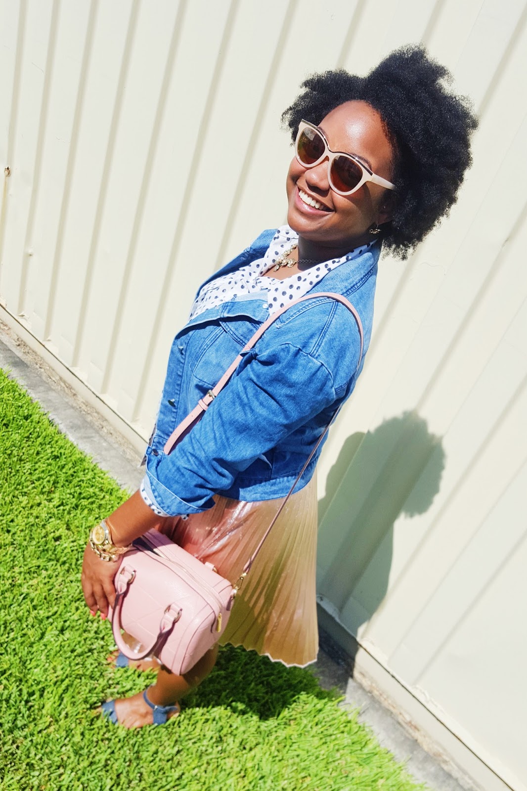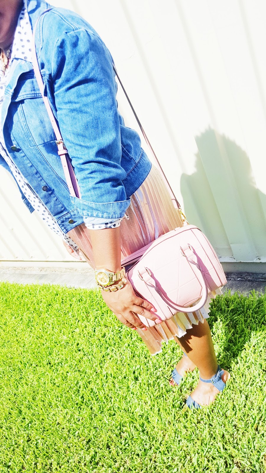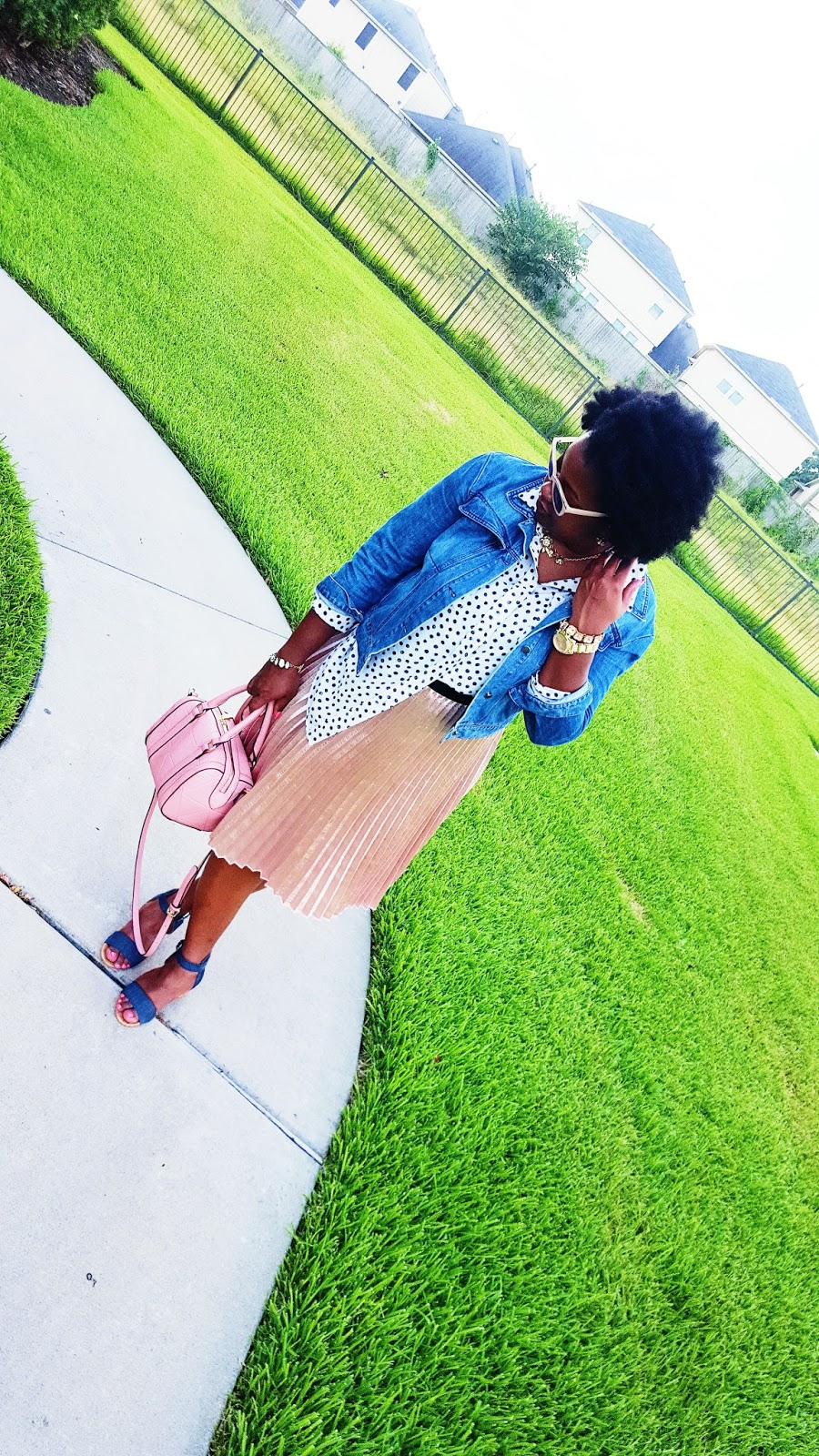Hey sweetie pies! Happy Tuesday! I hope you all had a great day! Check out this look that I created for work. I started with my rose gold pleated skirt and added some dimension with the polka dot blouse. To keep it fun and light, I opted for my denim jacket and denim sandals. I decided to do a half tuck with my blouse to make it more interesting and dimensional.