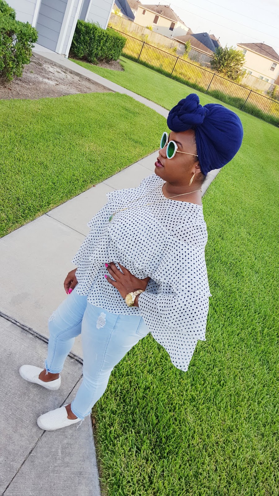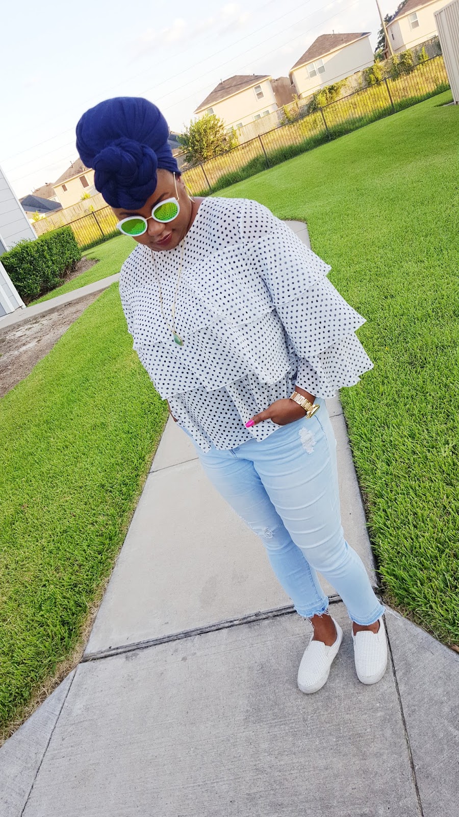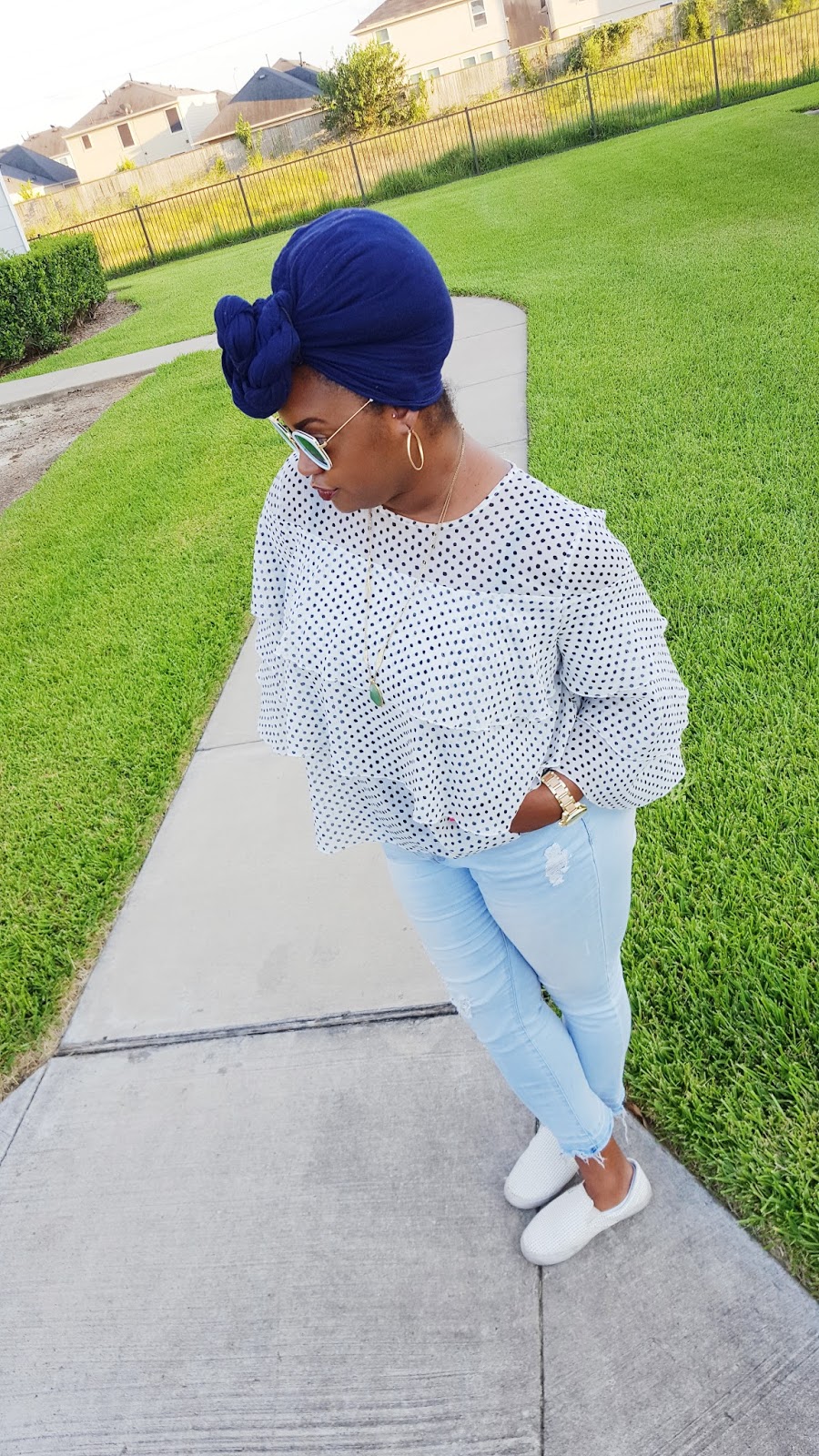 What do you sweetie pies think of this look? I have been living in sneakers the past couple of weeks. I decided to throw on a ruffle blouse, ripped denim with sneakers last week and loved the results! It is great daytime look for running errands or catching lunch with friends. You guys know that I obsessed with this ruffle blouse from Target. To see another way I styled this blouse, check out my ruffles galore post. I practically live in these jeans they’re so comfy! I kept my jewelry simple with hoops, long pendant necklace and my fave watch at the moment. I tied my hair in a turban because lately it has been too hot for really anything else. And lastly I added these sunnies that I got last month and I have been obsessed with these! I love them so much that I have been wearing them with everything!