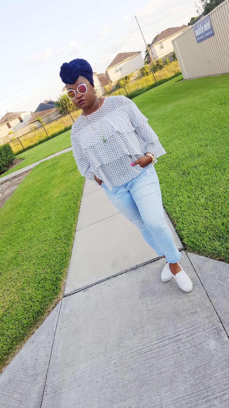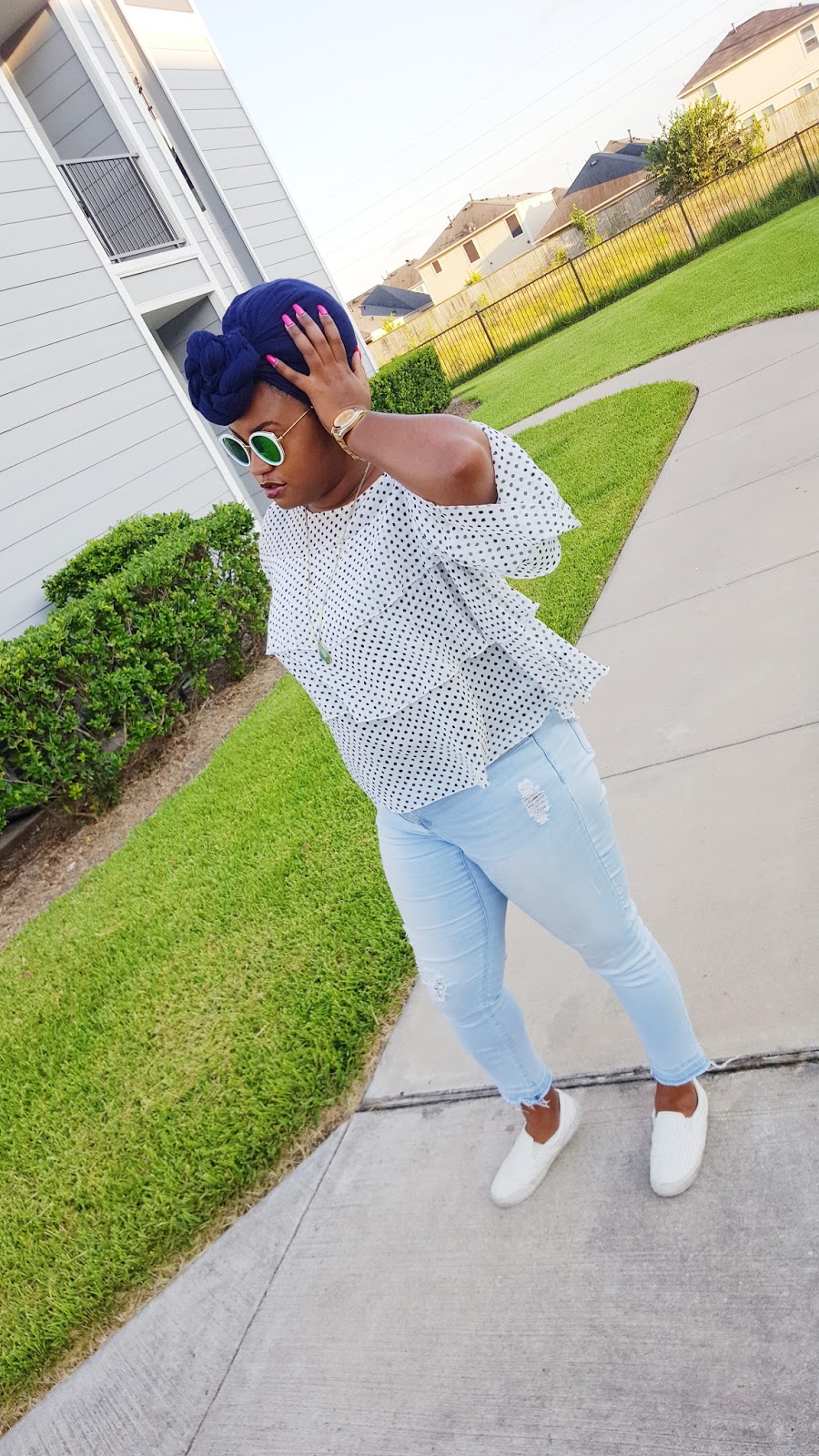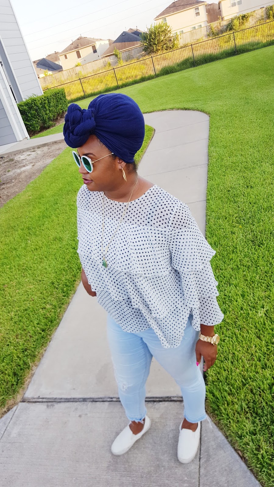 What do you sweetie pies think of this look? I have been living in sneakers the past couple of weeks. I decided to throw on a ruffle blouse, ripped denim with sneakers last week and loved the results! It is great daytime look for running errands or catching lunch with friends. You guys know that I obsessed with this ruffle blouse from Target. To see another way I styled this blouse, check out my ruffles galore post. I practically live in these jeans they’re so comfy! I kept my jewelry simple with hoops, long pendant necklace and my fave watch at the moment. I tied my hair in a turban because lately it has been too hot for really anything else. And lastly I added these sunnies that I got last month and I have been obsessed with these! I love them so much that I have been wearing them with everything!