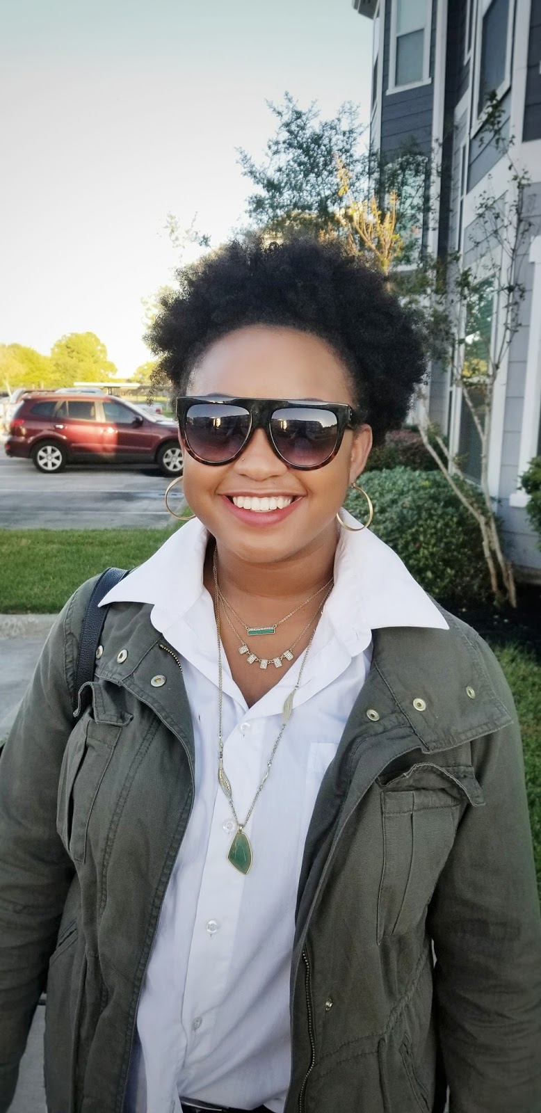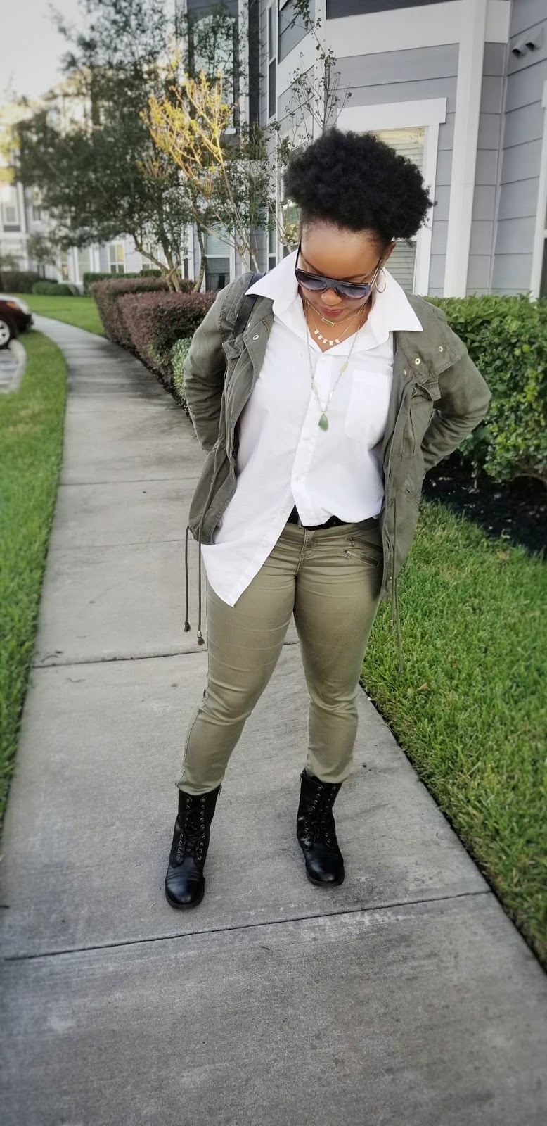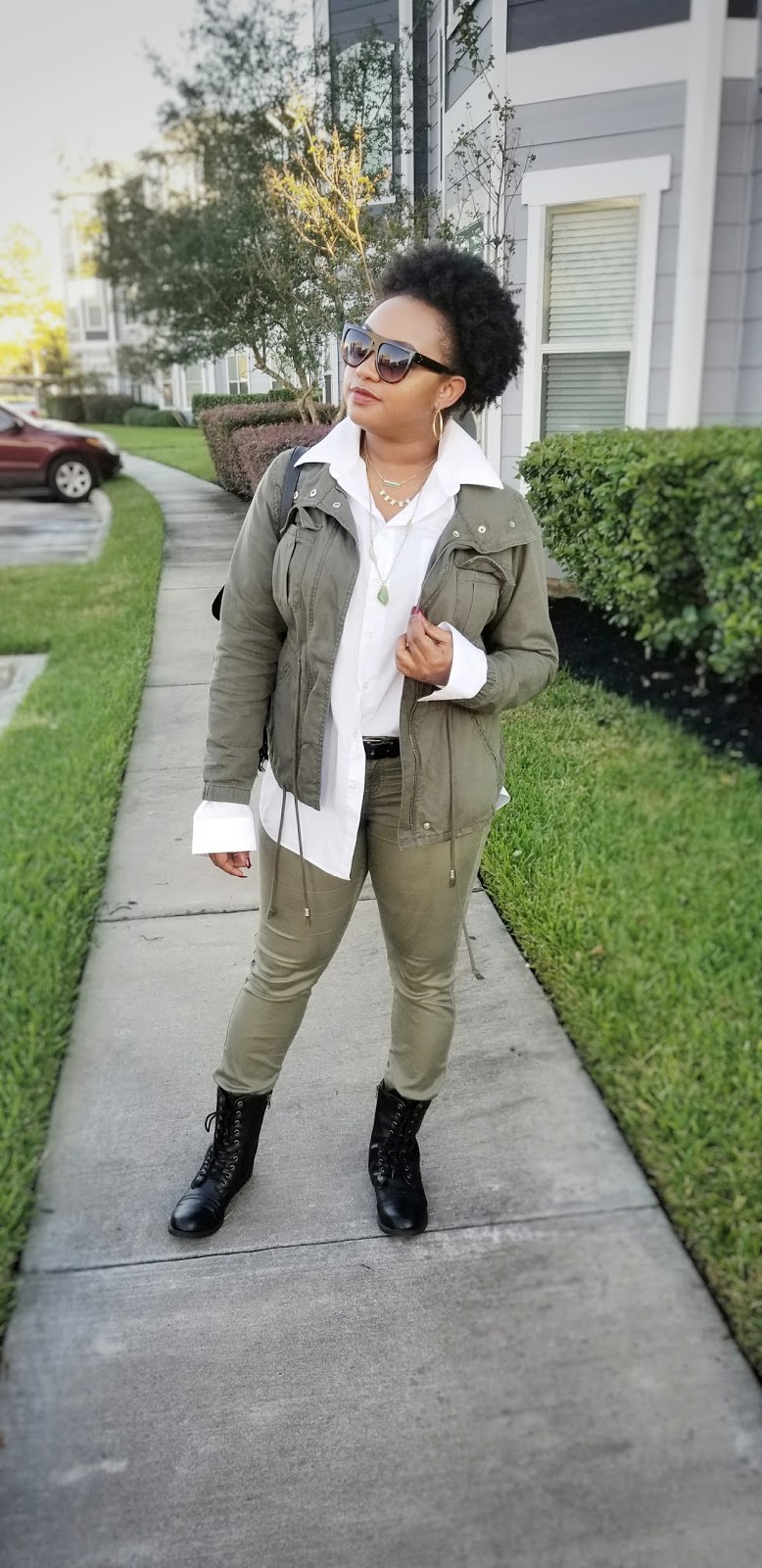 Happy hump day sweetie pies! For today’s post I am sharing this outfit that I wore last week. I wanted to wear this utilitarian jacket and I figured why not offer to wear it with some olive pants and oversized button down? I created the side tuck so that the shirt wouldn’t overwhelm my frame. Plus I don’t want to look like a bag lady. I wanted to keep this look a little tough so I opted for these boots – plus they are comfortable! I threw on my backpack purse and completed the look with these sunnies, layered gold jewelry and a red lip. The red lip allowed me the feminine touch that I wanted while keeping the rest of my outfit casual with a slight edge. The best tip when layering necklaces is to opt for various lengths so that it doesn’t overwhelm the look or come off tacky.