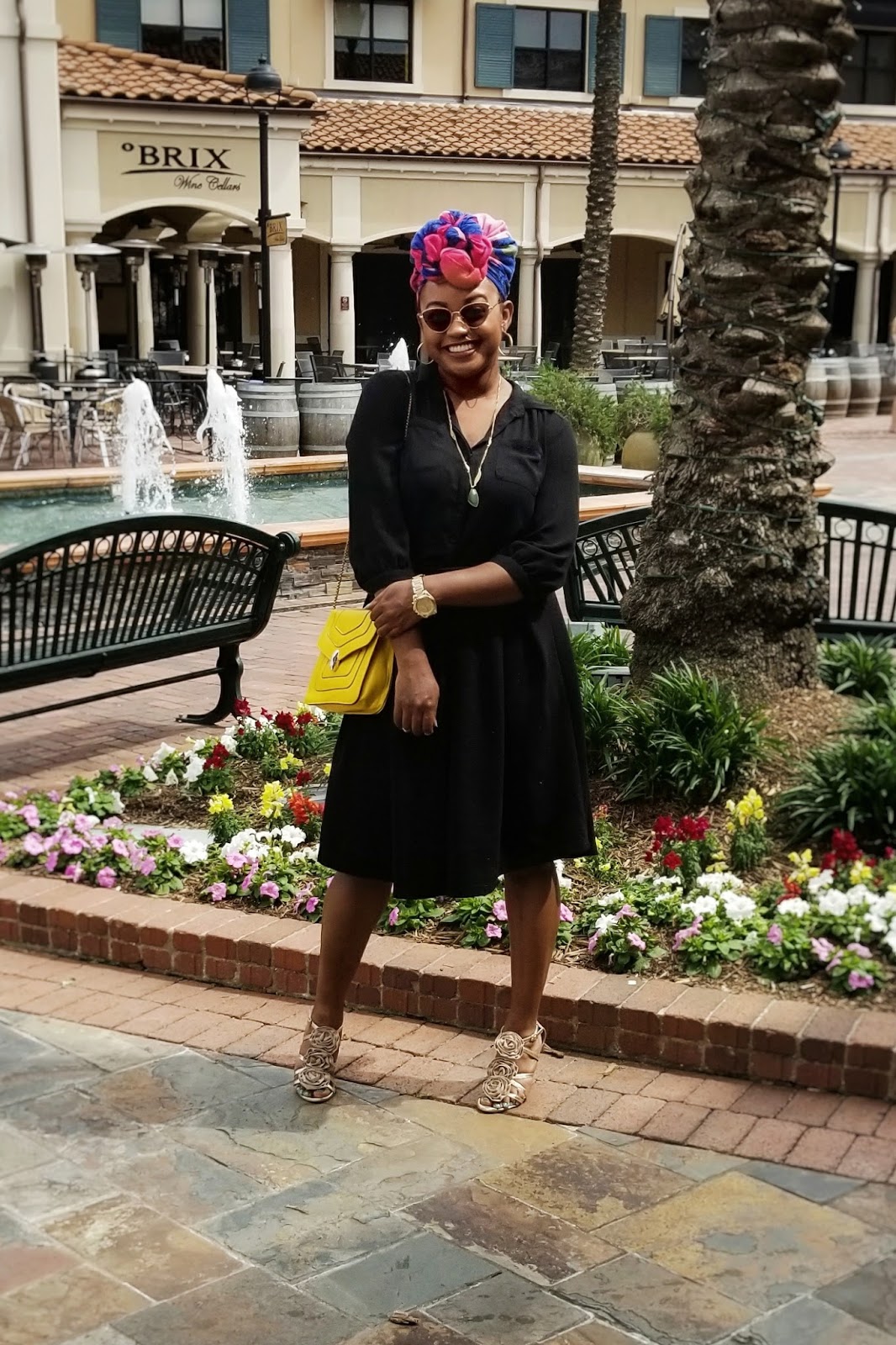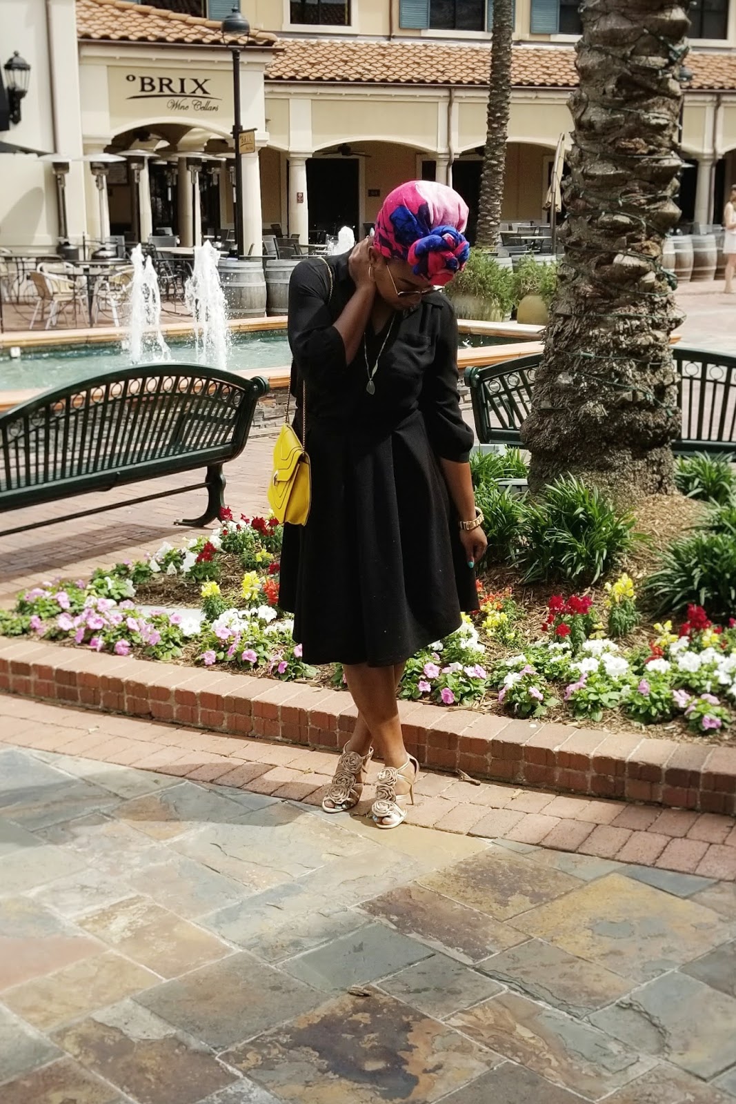 This is a blouse and skirt combo that I gravitate towards a lot. The waist band on the skirt really helps to cinch me in. (A big plus for me so I don’t lose my figure in this full skirt.) I opted for this colorful scarf because, why not?! I wanted to wear these gold strappy heels so I opted for gold jewelry. I kept it minimal for a chic feel.