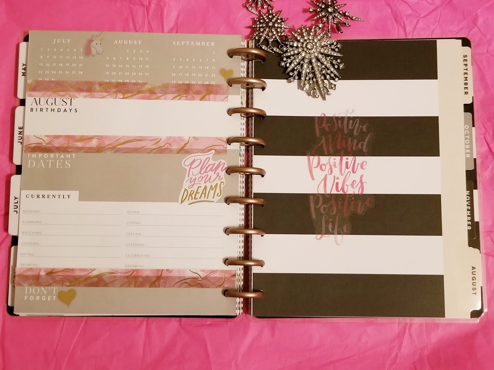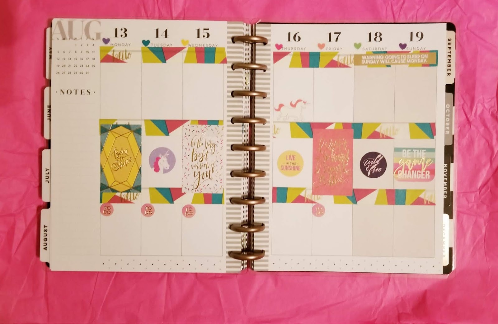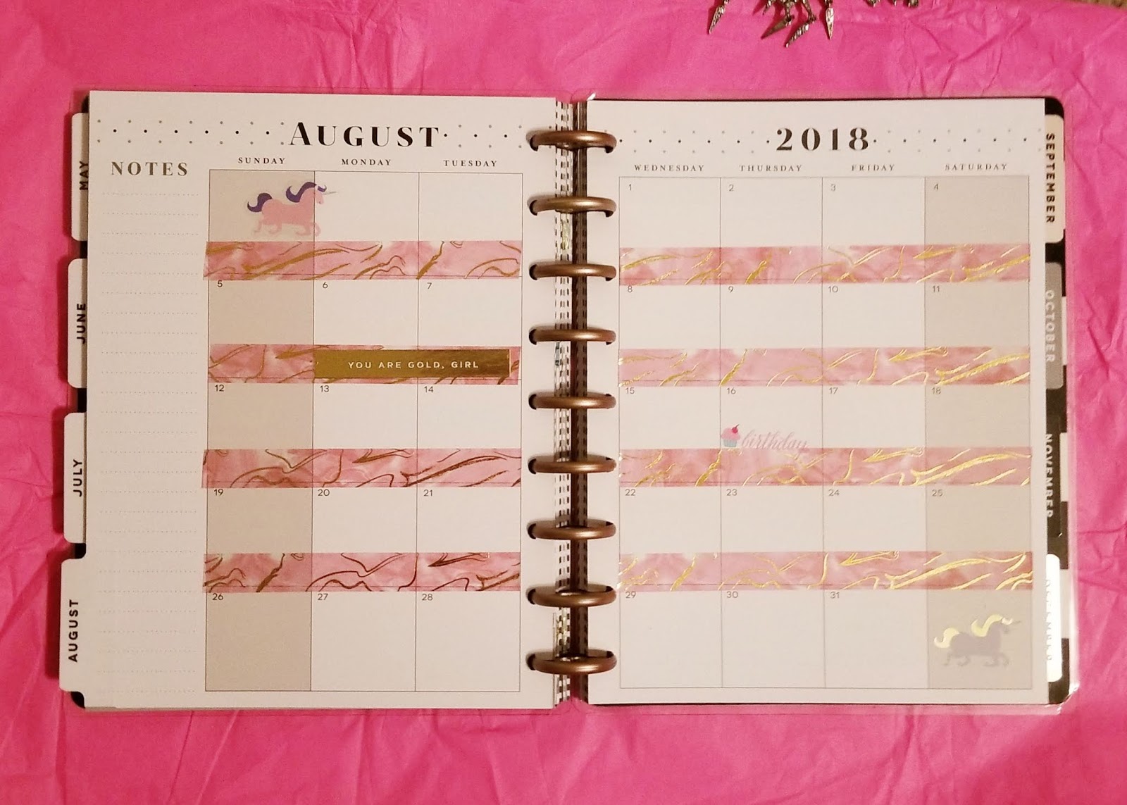 I was totes geeked when I saw the sticker book had unicorns! Pages of them! I am obsessed with pretty much anything unicorn. I love this pink and gold washi so much that I decided to use it for my monthly layout. It is two of my favorite things, pink and gold foil! Of course I got a sticker for my birthday. 🙂