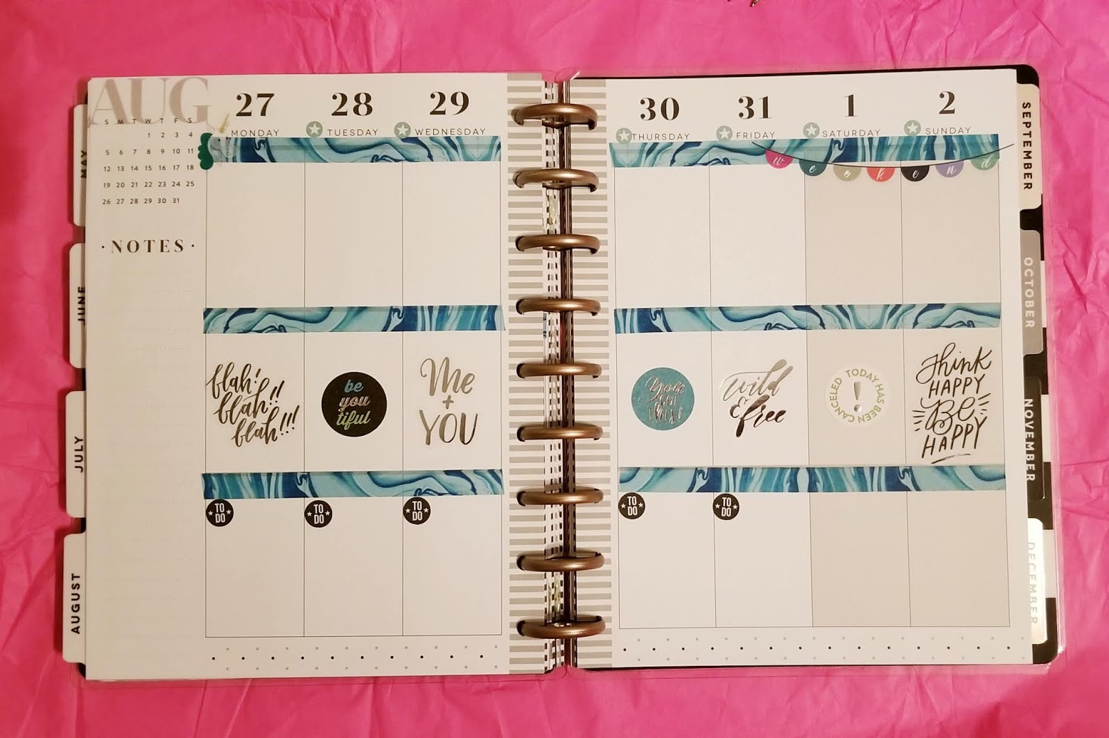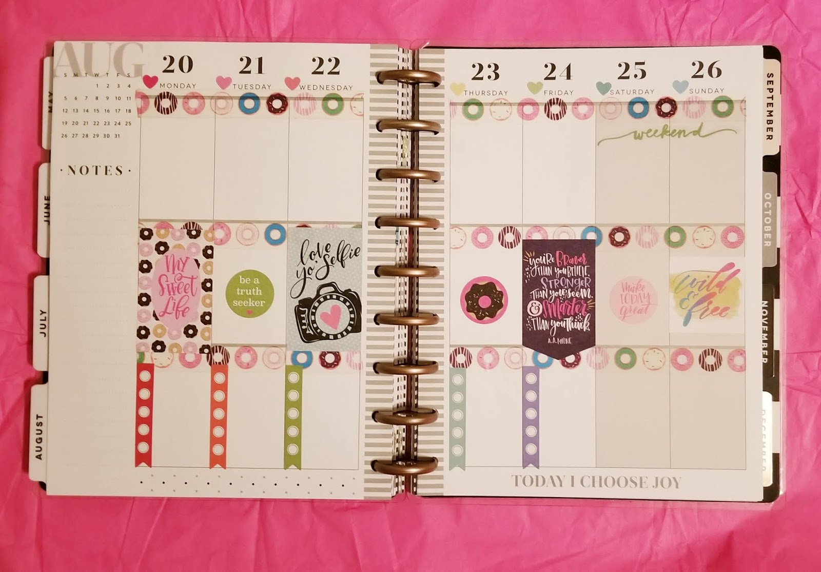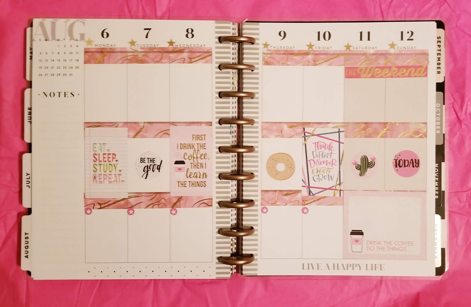 I was totes geeked when I saw the sticker book had unicorns! Pages of them! I am obsessed with pretty much anything unicorn. I love this pink and gold washi so much that I decided to use it for my monthly layout. It is two of my favorite things, pink and gold foil! Of course I got a sticker for my birthday. 🙂