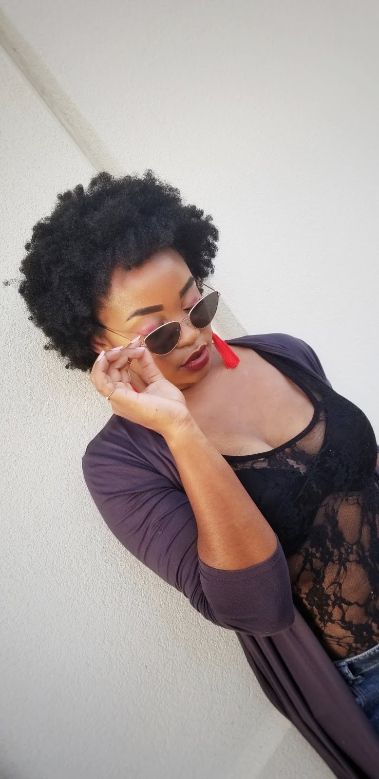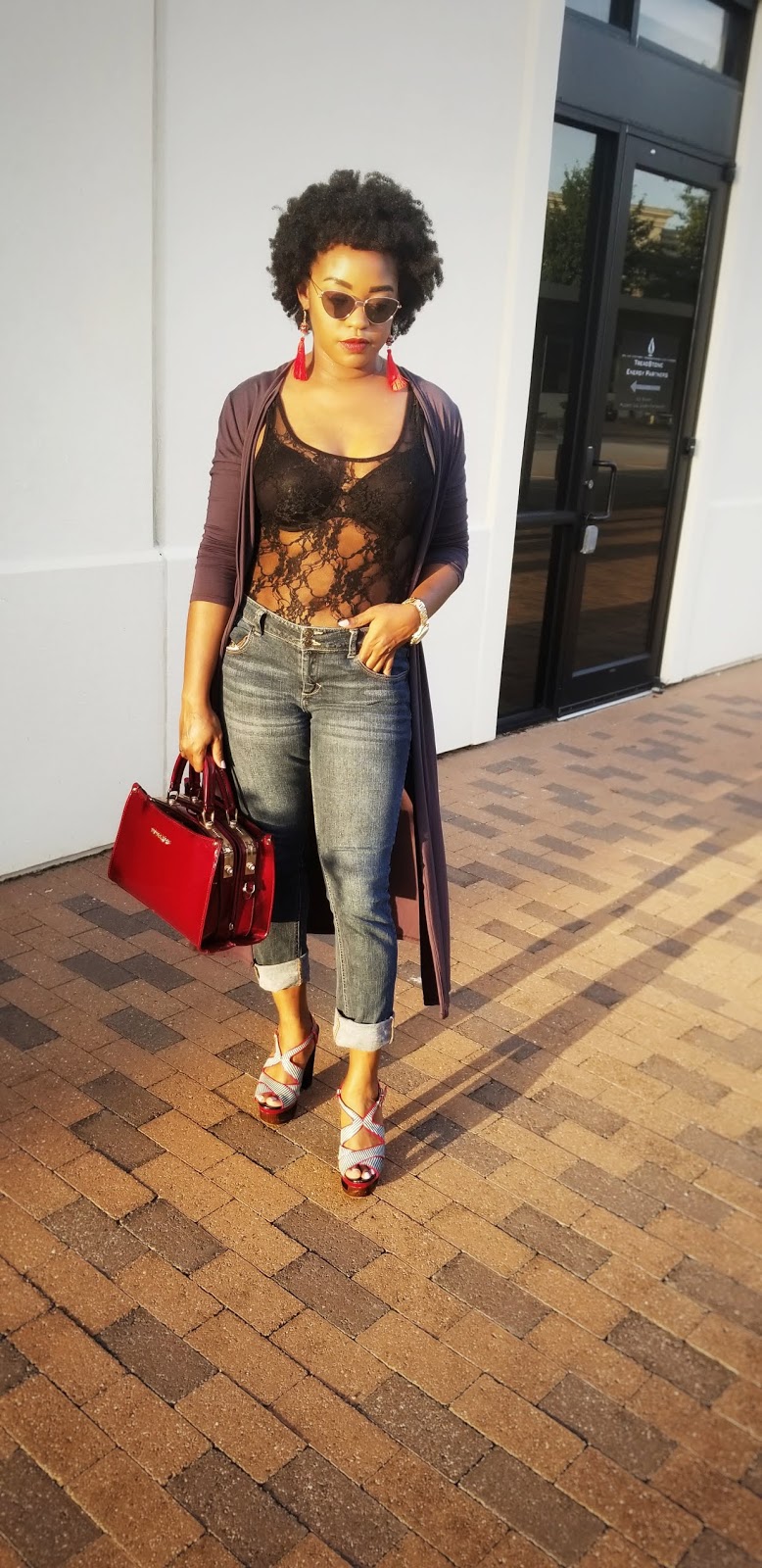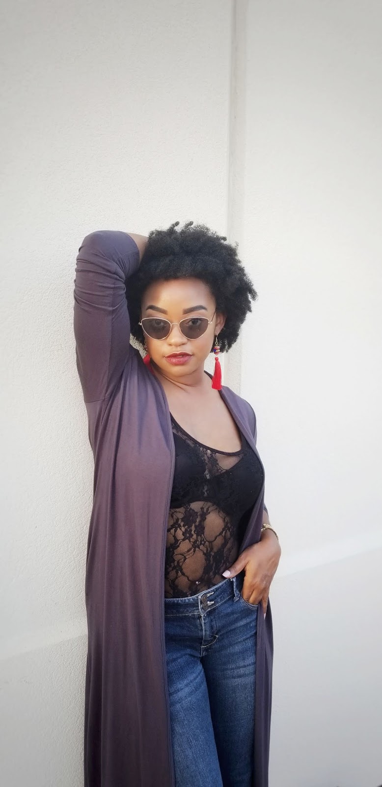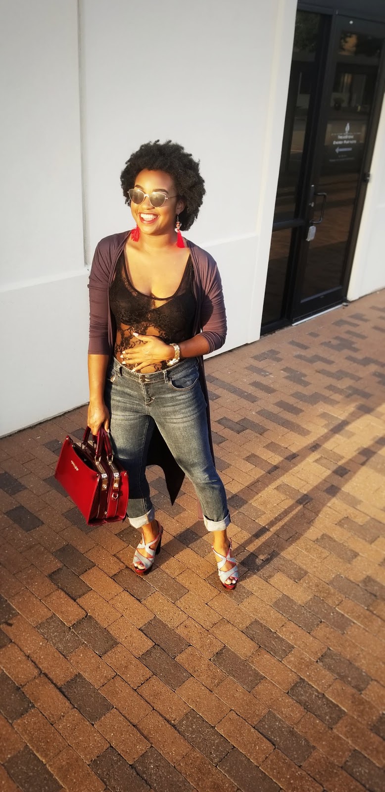 I opted for a casual glam look with a hint of sexy. I have worn this lace bodysuit to perform in a couple of times but I’ve never been bold enough to wear it in public. I am so glad that I did! I felt so fabulous, eeeeoooowwww! This long cardigan is super comfy! It’s not too thin, not too thick and has a nice fit. Of course, I am back with the cat eye sunnies! They just go so well with everything!