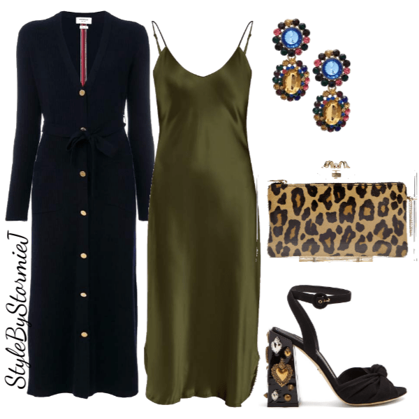 Perfect for a date night, this look definitely exudes femininity and sex appeal. Slip dresses are everywhere this season. Find one that caresses your figure and make you feel like the best version of yourself. This long cardigan is super cozy and great for snuggling with your hun. A pair of bejeweled sandals and statement earrings add an air of sophistication. Completed with this clear leopard clutch for a touch of sassiness.