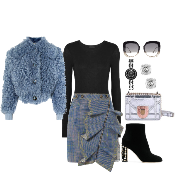 I love this look. This is totally something I would wear. Bodysuits are so universal and flattering like this long sleeved one. Paired it with this fun skirt. I love the ruffle and zipper detail. Teddy bear coats are super fun and stylish. Stand out in a sea of whites, blacks and pinks with this icy blue teddy bear coat. Metallic accessories are the way with this crossbody handbag and embellished ankle booties. Keep the jewelry simple and of course a pair of matching glasses to complete the look.