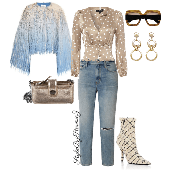 Obsessed with this silk polka dot blouse that I paired with denim and booties. A pair of statement earrings and sunnies of course add to the look. A metallic handbag because, why not? Lastly this sequin fringe coat to take it all. the. WAY! I am obsessed with this coat. It is super glam and super fun! What do you think?
