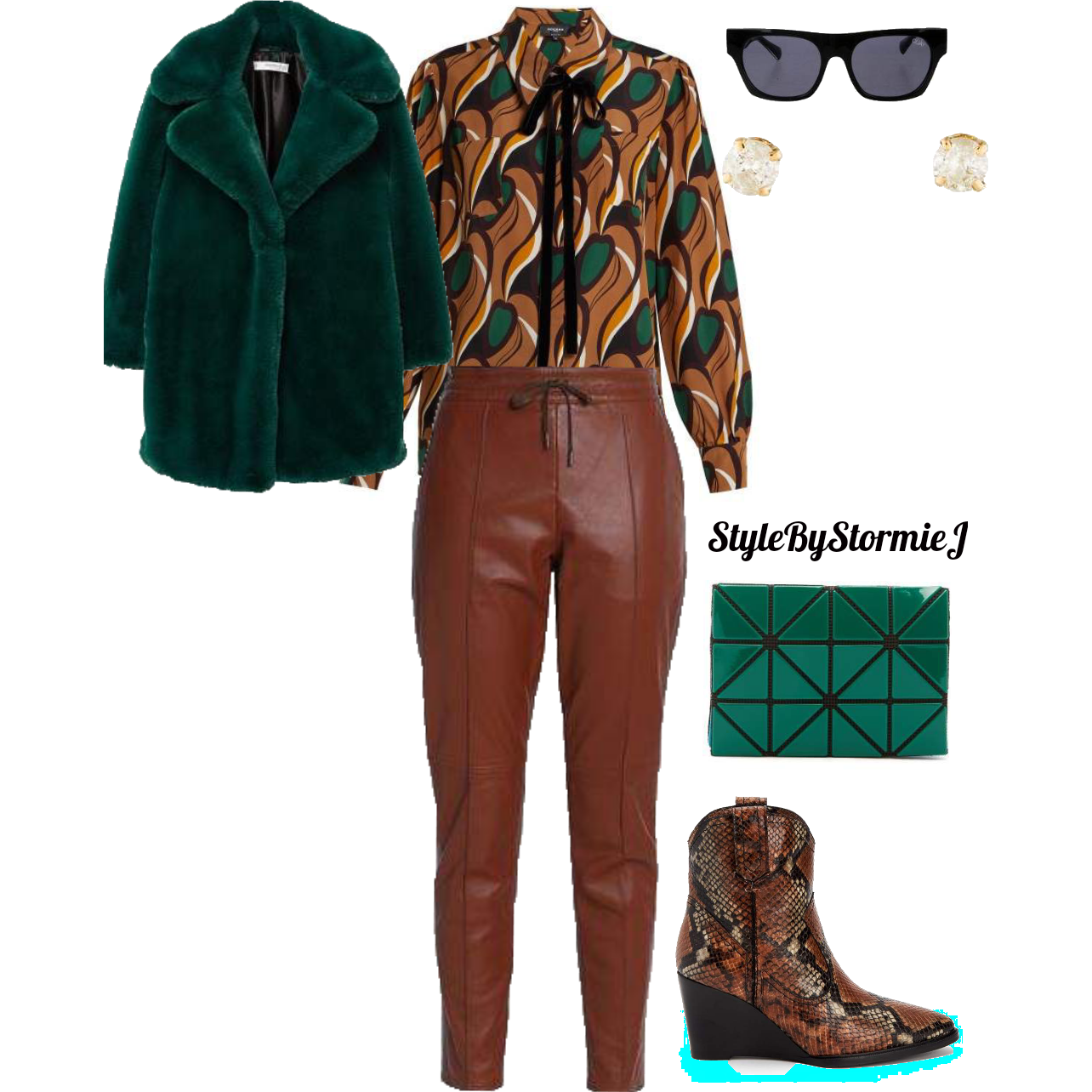 Nothing like playing with textures and bold prints such as the ones seen in this look. A pair of brown leather pants paired with this print blouse to start. Then I added these boots that are a bit different from what I would normally go for – making it the best time to try them right? Then I added this fun geometric mosaic clutch in this bright green to compliment the green in the blouse. Next I added this faux fur coat because it is so luxe and looks so good in this jewel tone. Lastly I added a pair of simple black sunnies and a pair of stud earrings to complete the look.
