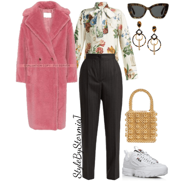 This look is not for the faint at heart or those hesitant to experiment with fashion. This look begins with a floral print blouse and grey pinstripe high waist pants. I am all about bringing together completely different pieces to create a unique aesthetic. These chunky Fila sneakers do just that while adding a layer of comfort. A soft pink teddy coat adds a pop of color. Completed with this dark sunnies, geometric earrings and a pearl handbag that I am totally crushing on right now. This is a great everyday look for a fashionista who loves a challenge.