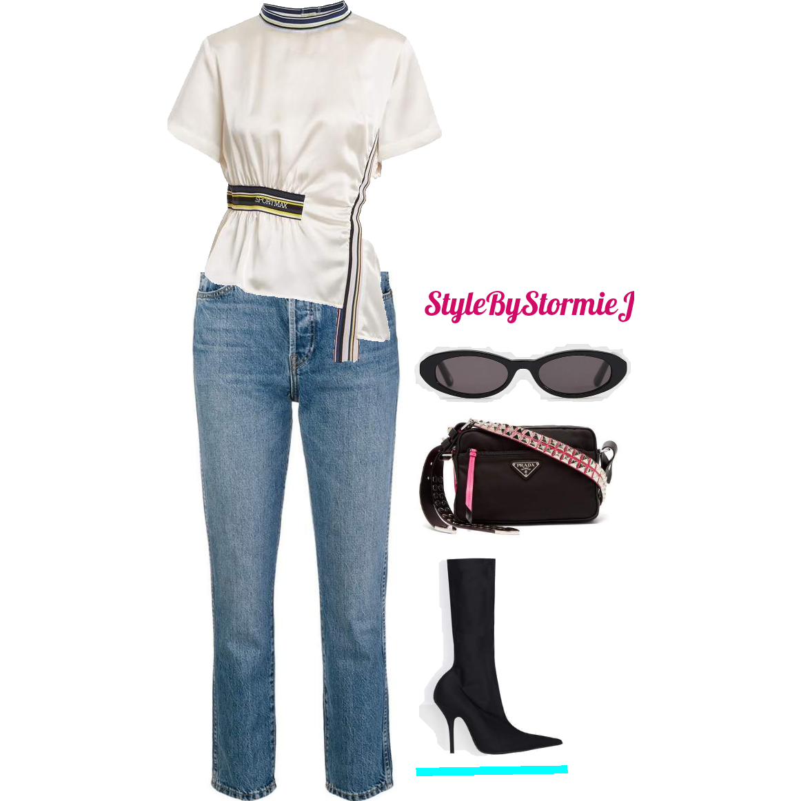 This is a fuss free look with denim and a cool top. What makes this top so interesting is not just the material but the shape of the blouse as well. This top is also great for highlighting your waist. A pair of black booties, sunnies and a crossbody handbag round out this look. Look is perfect for a chill night out with some friends.