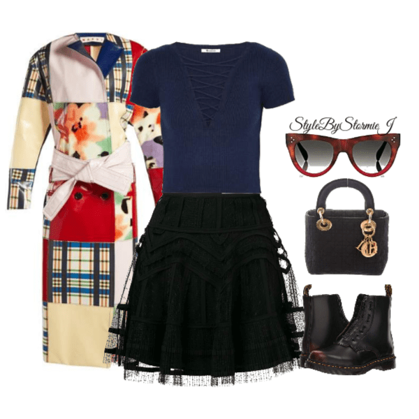 I call this look the “drama queen”. This look is all about drama and extra. The lace skirt paired with this low cut cashmere top and Doc Martens creates an edgy look. To lighten it up a bit, I opted for this patchwork trench coat which is definitely a conversation starter. Complete this look with a mini tote and oversized sunglasses for a day out.