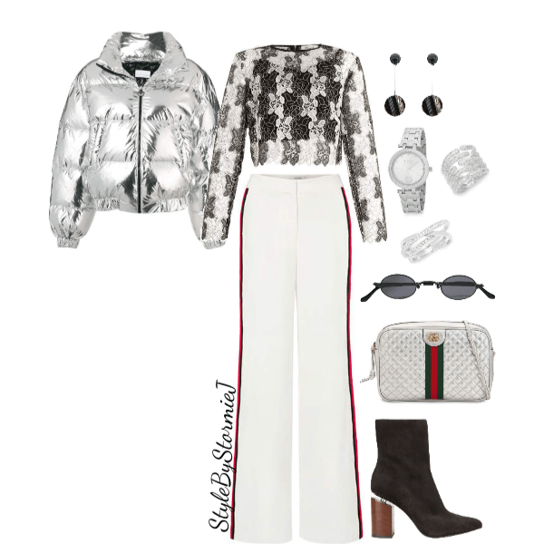 This look is super fun with a mix of metallic and textures. These “track pants” inspired trousers are super chic and look great with this lace top. Breaking one popular fashion rule which is wearing white after Labor Day. I believe you should wear what you want to wear when you feel like it! Plus this looks great with this metallic puffer coat. A pair of black dangle earrings, silver jewelry, metallic handbag and cool sunnies accessorize this look and bring it to life. Lastly, a pair of chunky black boots that offer style as well as comfort. I call this look “New York Minute” as I can picture someone rocking this look in the middle of Times Square while hailing a cab. What do you sweetie pies think?