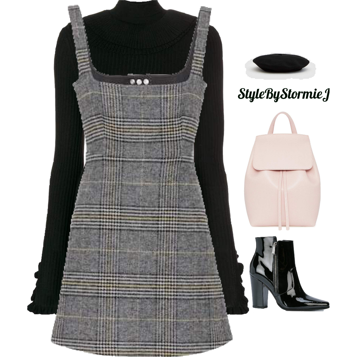 Anyone else get Clueless vibes from the 90s? This look is super fun and girly with a fit and flare plaid dress, layered with a black turtleneck and booties. A felt beret and a pink backpack to add a bit of color to the look. This look is super easy to recreate and make it your own.