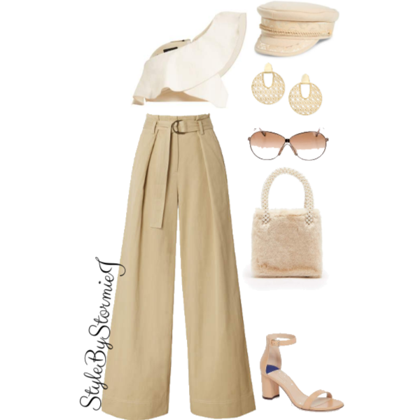 To start, I opted for this gorgeous one shoulder off white top with ruffle details. Then I paired it with these khaki wide legs pants to add some dimension. For shoes, I opted with a pair of minimalist nude heels with a low heel for long term comfort. For jewelry, I kept it simple with a pair of hoop earrings and added these nude sunnies. This handbag is totally on trend with the faux fur and the pearl strap, making it one of a kind. Lastly, baker boy caps are returning this season but opt for an upgrade. This cap comes in a nice nude color with gold chain details.