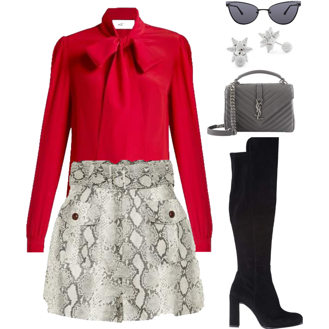pair looks great with this red bow blouse with black over the knee boots. A gray designer handbag to add bit of luxe – completed with sparkly earrings and cateye sunglasses.