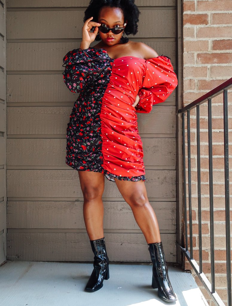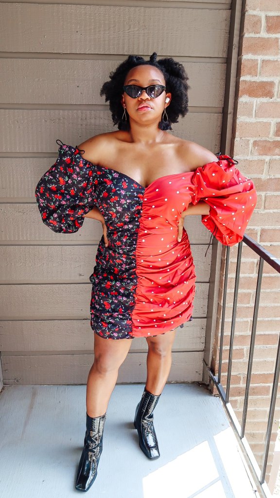 When I saw this dress, I fell in love. First thing that caught my eye were the prints. They were so different but complimented so well. The floral and polka dot was giving me spring vibes while the red and navy gives me autumnal vibes. This dress would look great with sandals, sneakers or boots. The balloon sleeves add so much drama! My favorite part is this sweetheart neckline that highlights the decolletage nicely. P.S. – Available in sizes small to 3X