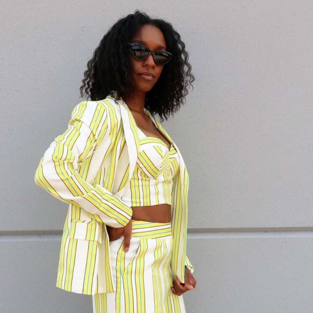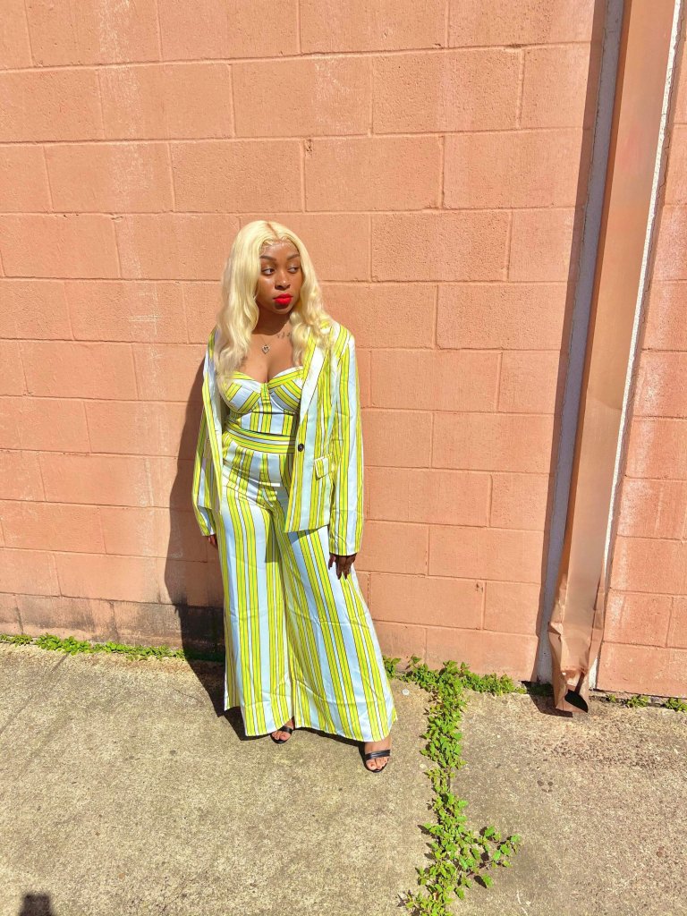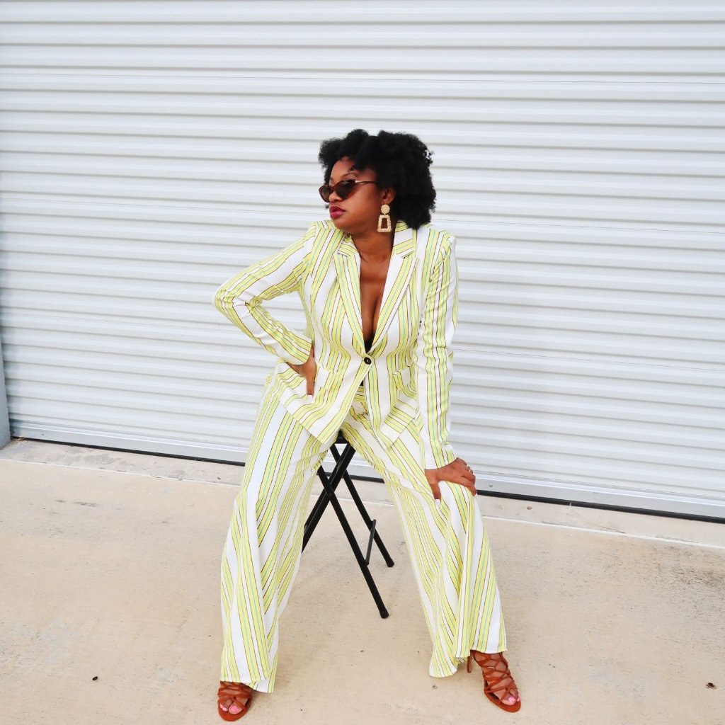 Destined to stand out in the sea of black, blue and gray suits! This suit set is bold in style and design! The yellow and green candy stripes paired with the bustier crop top of the same print will steal the scene every time! High waist wide leg trousers adds dimension while keeping it sensual. Show them you mean business in the boldest, most colorful way!