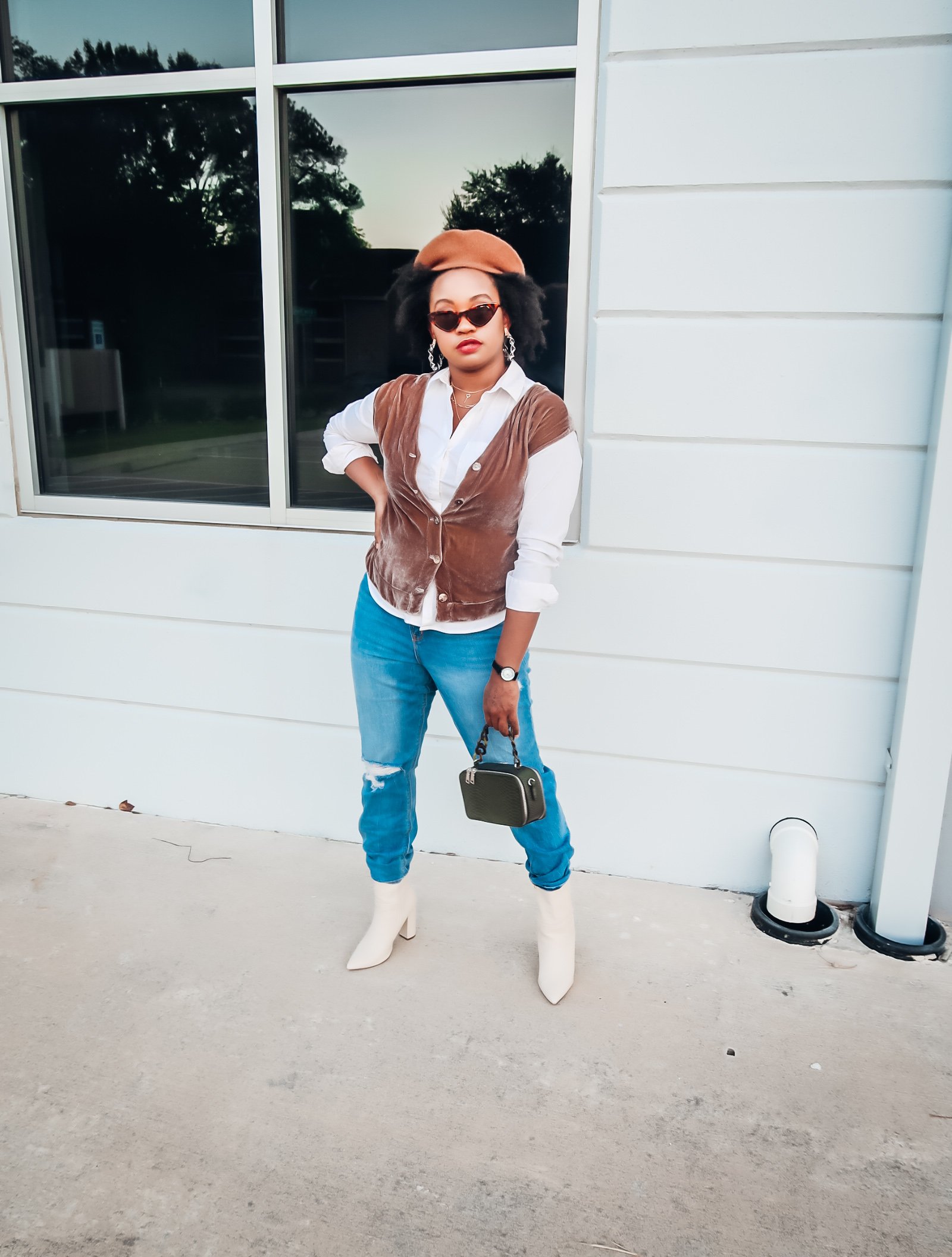 The base of this outfit is a simple white button down paired with a pair of slightly distressed denim. Next I added these booties (SIMILAR) and then added this vest. Grandpa sweater vests are a surprising trend this season. Thankful to my Nana and my procrastination – I came across this beautiful velvet vest. Thanks Nana for giving me this a few years ago! (Even though I didn’t appreciate it then.) I am so glad that I kept it! It went perfectly adding depth to the look. I already knew that I wanted to wear the beret so once I found this vest – it clicked. For additional accessories, I opted for acrylic hoop earrings, a 3-tiered layered necklace, cateye sunnies and small handbag with an acrylic chain strap.