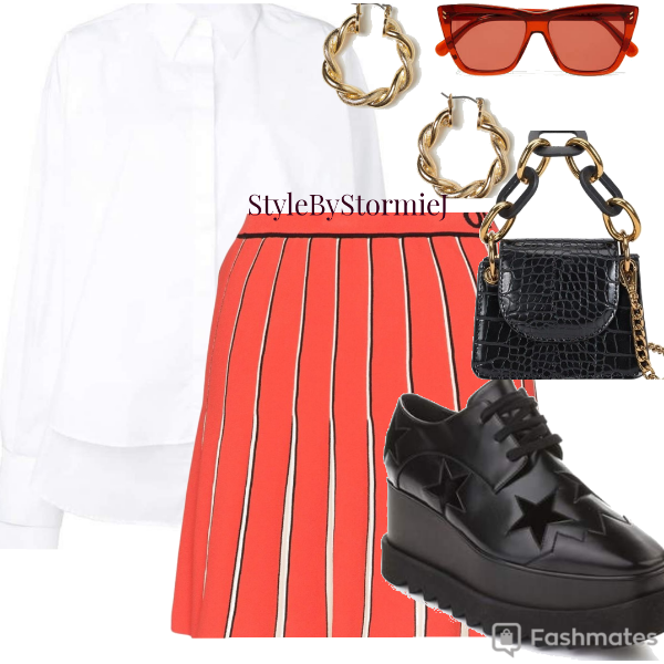 90s style is definitely trending with pleated skirts and platform shoes. This look is definitely giving edgy schoolgirl vibes. Twisted hoops, colored sunnies, and a mini handbag complete this look.