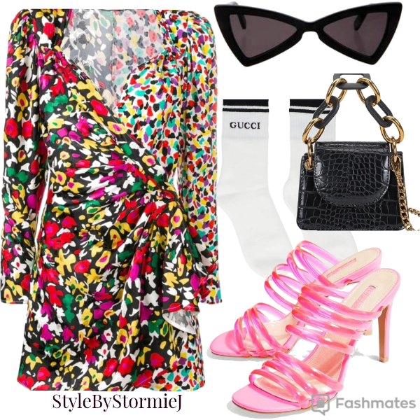 This look gives me total 80s vibes! I love that decade in fashion bc everything was bold and colorful. People weren’t afraid to experiment with their fashion. I challenged myself by pairing these neon open toe mules with socks. At one point of time in my life, I said I would never do that but here we are! I must say, this look is probably one of my favorites. It’s so unique and fun! Bold cat eye sunnies and a mini handbag take a comfortable back seat to this colorful wrap dress.