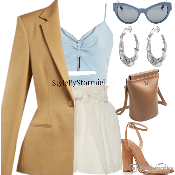 Preppy Sophisticate is the style we’re giving this look. This beautiful baby blue crop top with this cutout is super cute. Pairing it with this ivory shorts in this flowy fabric is great for those breezy afternoons. To add a level of class to the look, top it off with a tan blazer, a wardrobe essential. Blue sunnies and silver earrings are super cute with this look. Completed with the Tami Handbag and tan sandals.