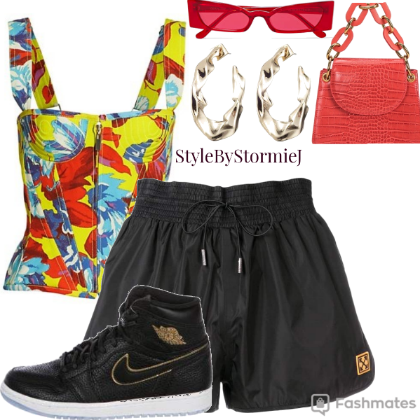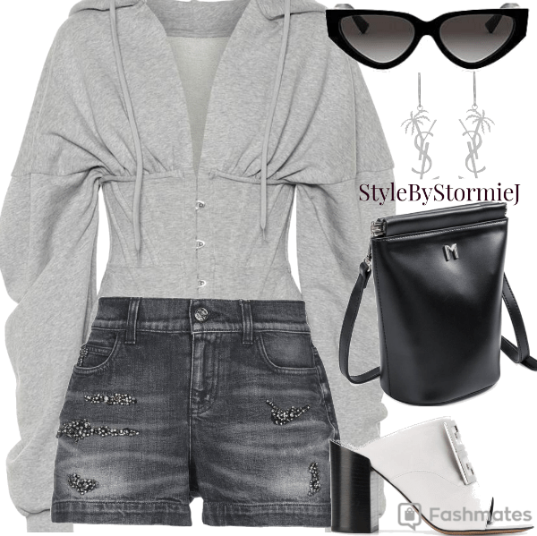 This look is great for running errands, but you still want to be fashionable. It gives a hint of practicality with the hoodie and shorts. The corset detail and mules make it interesting. Finish the look with a crossbody bag, sunnies and designer earrings.
