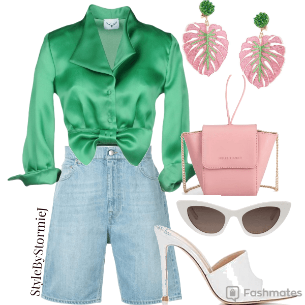 For the final look, I opted for denim shorts because everyone pretty much owns a pair of denim shorts. This look can be easily replicated with any blouse. In this look I opted for a green silk top because green is EVERYTHING at the moment. When I saw these earrings I immediately added these. They are super glam and elevates the look. Completed with white shoes and a pink handbag to compliment the earrings.