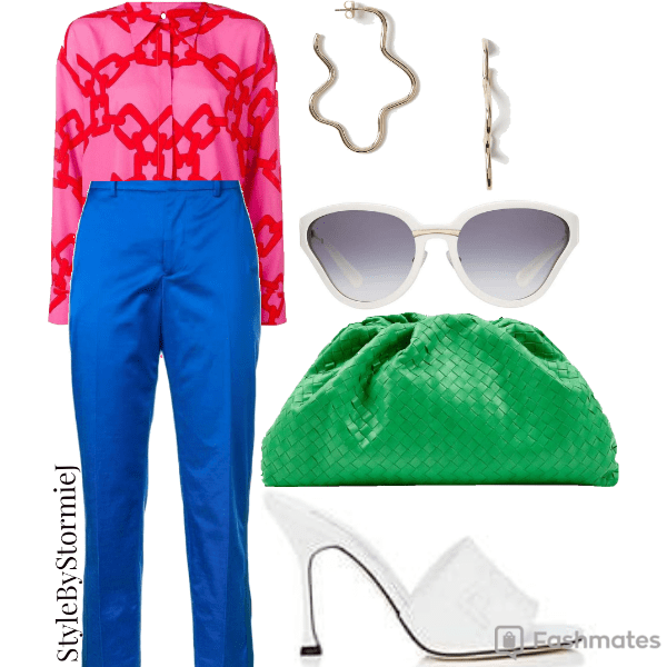 This next look is great for the office. Make color blocking corporate appropriate with tailored slacks and a button down. The mules can be easily swapped out for a pair of white pumps. This clutch is big enough to hold all of the essentials and perfect for happy hour after hours. These earrings are the perfect conversation starter with your fave colleague.