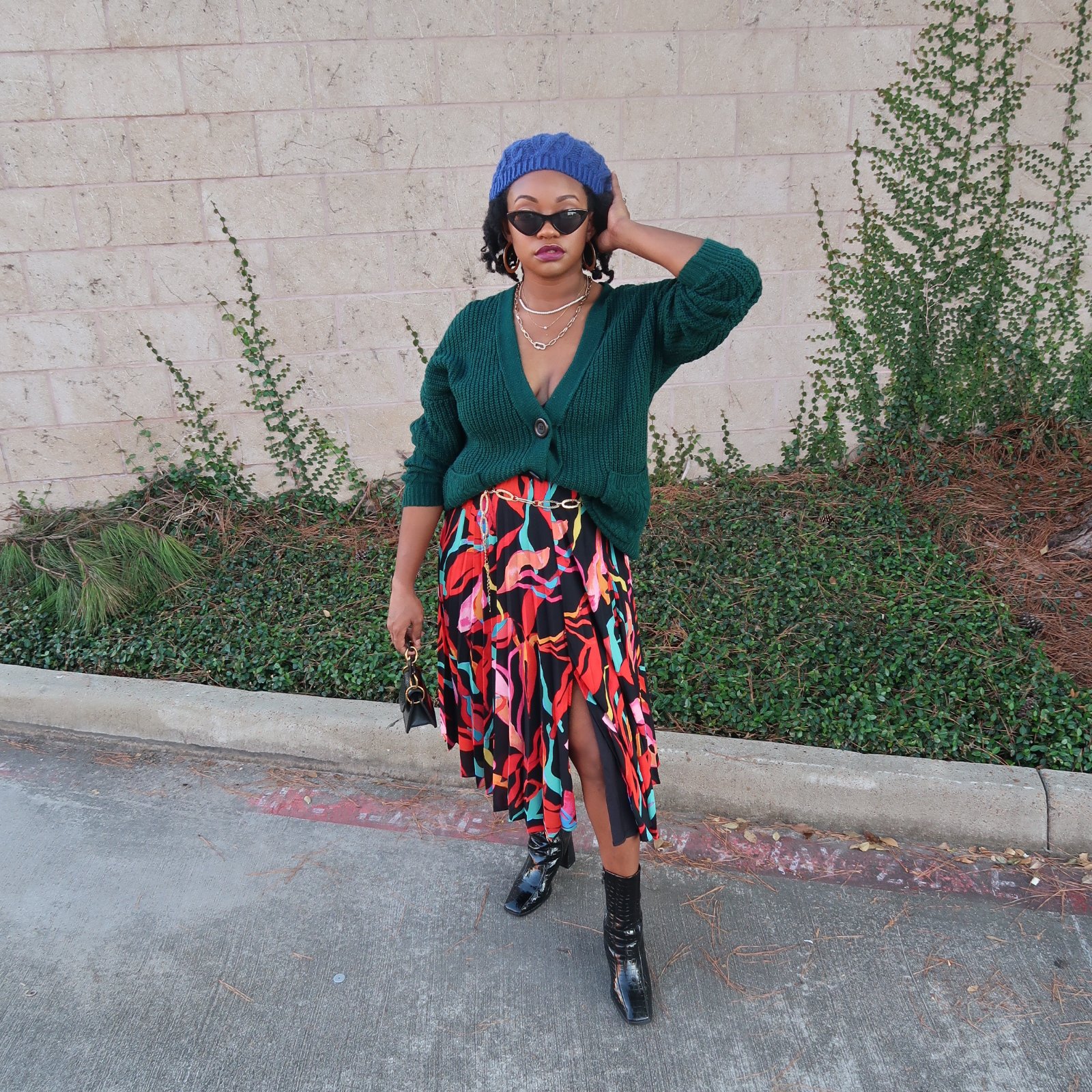 The second is definitely for my color lovers! It definitely gives an artistic vibe. This chunky cardigan is perfect for cooler temps. The colorful abstract print on the skirt is so fun! Faux croc boots paired perfectly with my Bella mini. The knit beret was the perfect touch to keep the look cozy! Cateye sunnies, chain belt and a few layered necklaces to accessorize the look.
