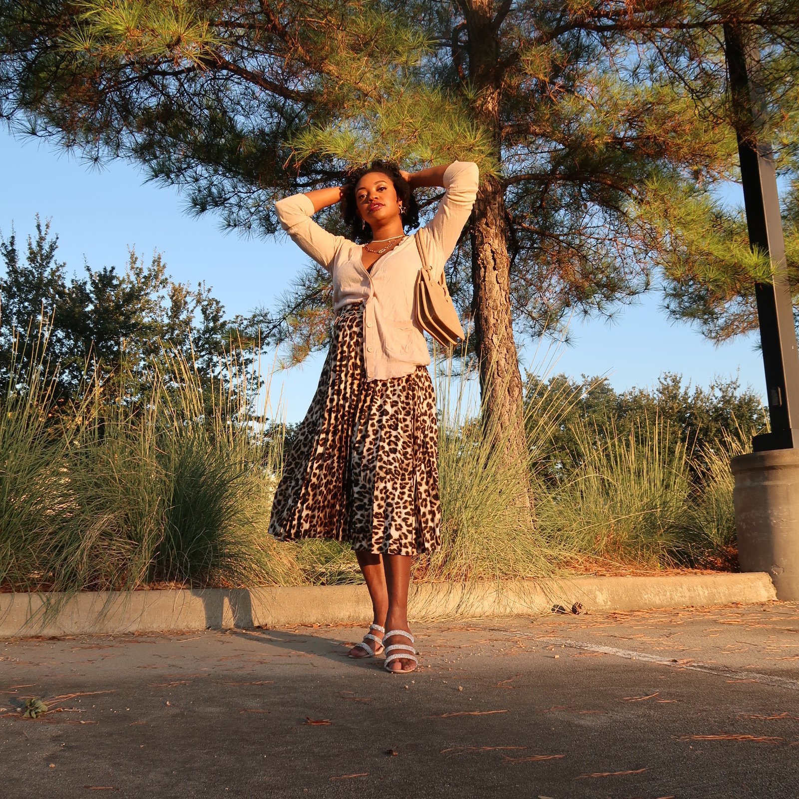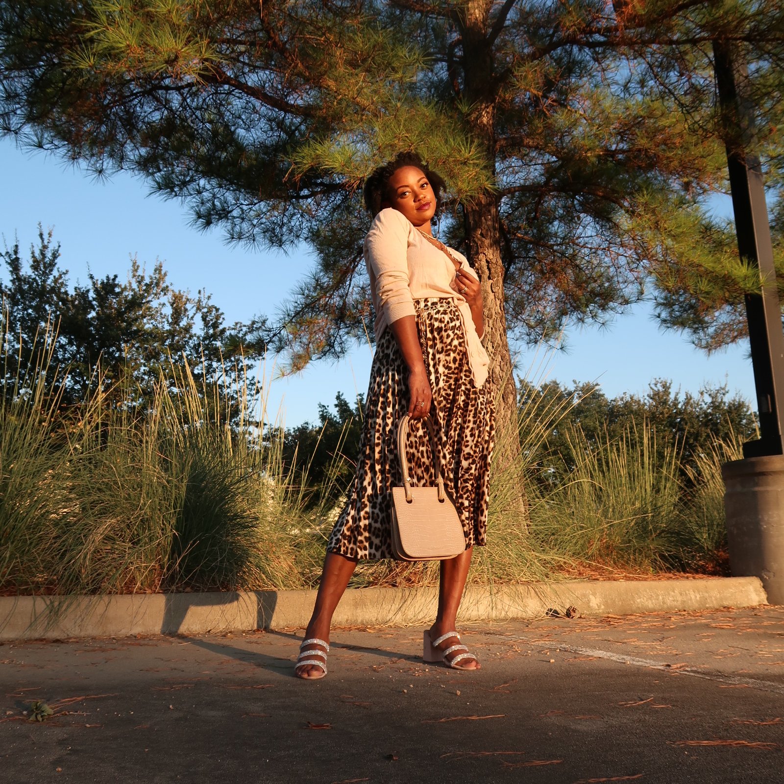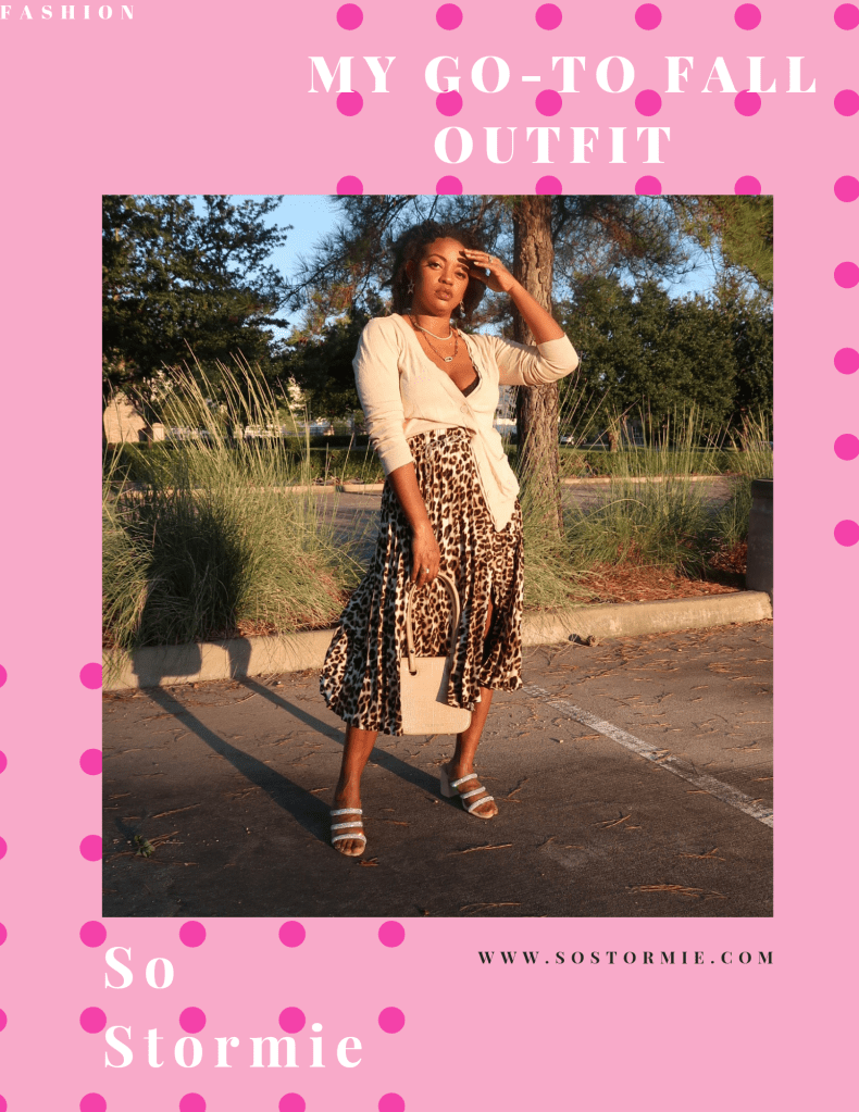 This first look is for a warm Autumn day in Texas with a classic, feminine vibe. This soft pink cardigan is thin and light. I loved pairing it with this leopard print skirt. I did a half tuck on the cardigan for waist definition and added a chain belt. These bedazzled mules are so stunning! They make me so happy! Lastly jewelry from my boutique and the new Taryn handbag to complete the look!