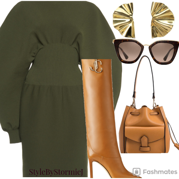Apparel with structure and movement is everything at the moment. These dramatic sleeves are stunning while the corset-style midsection provides contrast. Olive pairs beautifully with the color camel. The Cleopatra bucket bag and these boots look so good with the dress. Gold structured earrings and tortoiseshell sunglasses with gold hardware round out the look.