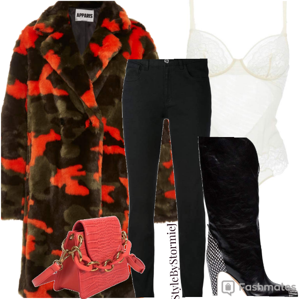 If your outerwear is what people see the most of, why not be bold? Stand out in the sea of black and brown coats with printed faux fur. This one has so much going on that I kept the rest of the outfit pretty basic. A white lace bodysuit – perfect for layering underneath a sweater. Black denim and black boots together are a simple and chic addition. I love the studded detail on this pair. Lastly, this bright neon bag brings out some more color.