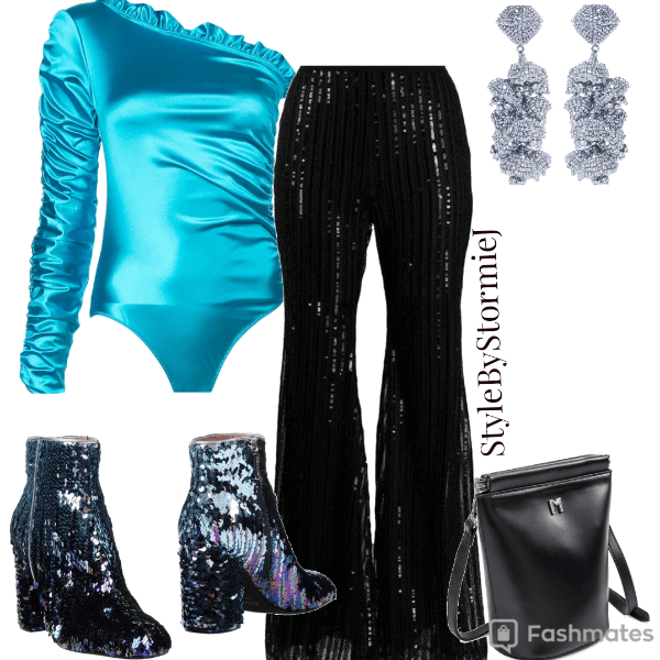 Shiny metallic has been everywhere this holiday season as well. Bold, shiny, glittery, or metallic have been grazing designers and fast-fashion brands alike. This one should ruffled bodysuit is super fun. To keep that fun, glam motif going, I opted for sequined pants with ombre sequined boots. Crystal dangling earrings and the Tami shoulder bag complete this look. I would definitely wear this look for a girls night out.