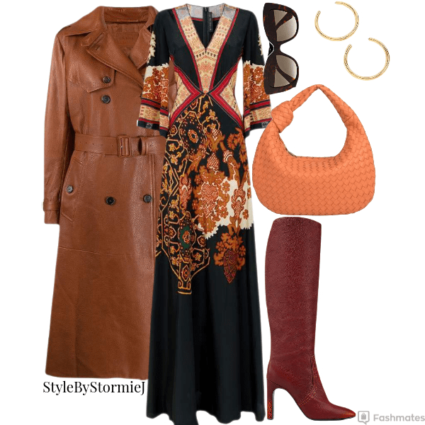Maxi skirts and dresses paired with boots are a stylish combo this season. This is a great way to dress warm and feminine. The print on this dress and the use of warm colors against the black are very striking. I opted to keep the rest of this look in neutral colors drawn from the dress. Sleek pointed-toe boots with a leather trench coat are giving textural chic. An oversized pair of sunnies, the Drew handbag, and gold hoop earrings complete the look.