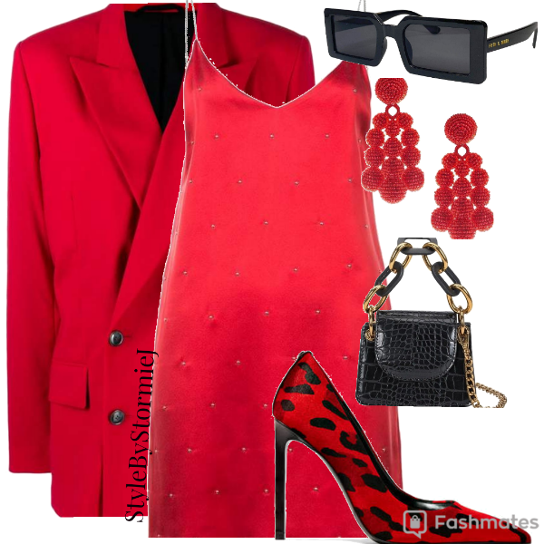 This look was created around the studded dress. Such a subtle, yet unique detail in the dress – perfect for a night out. Paired an oversized blazer in the same color for a bold statement. Red statement earrings and red leopard pumps to continue with the monochromatic look. Bella mini and Berlin sunglasses to break up the monotony just a bit.